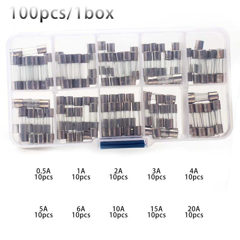 10 kinds of 100 pcs/1 box 5*20 fast-acting glass tube fuse car glass tube fuse matching kit 5X20 0.5A-20A household fuses