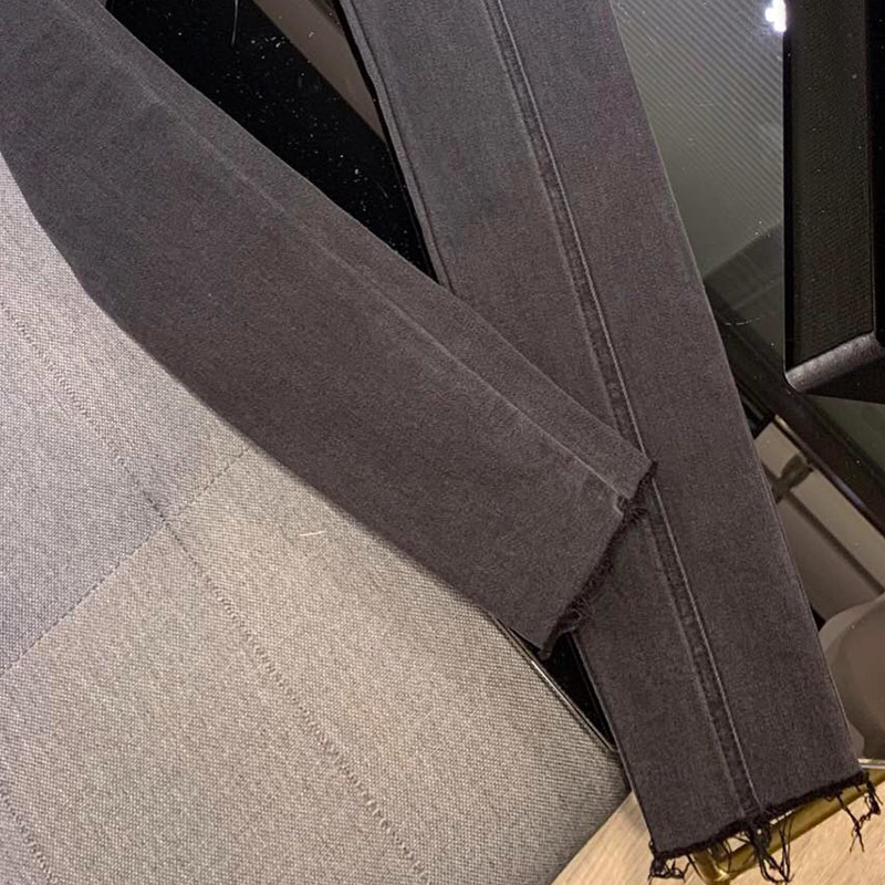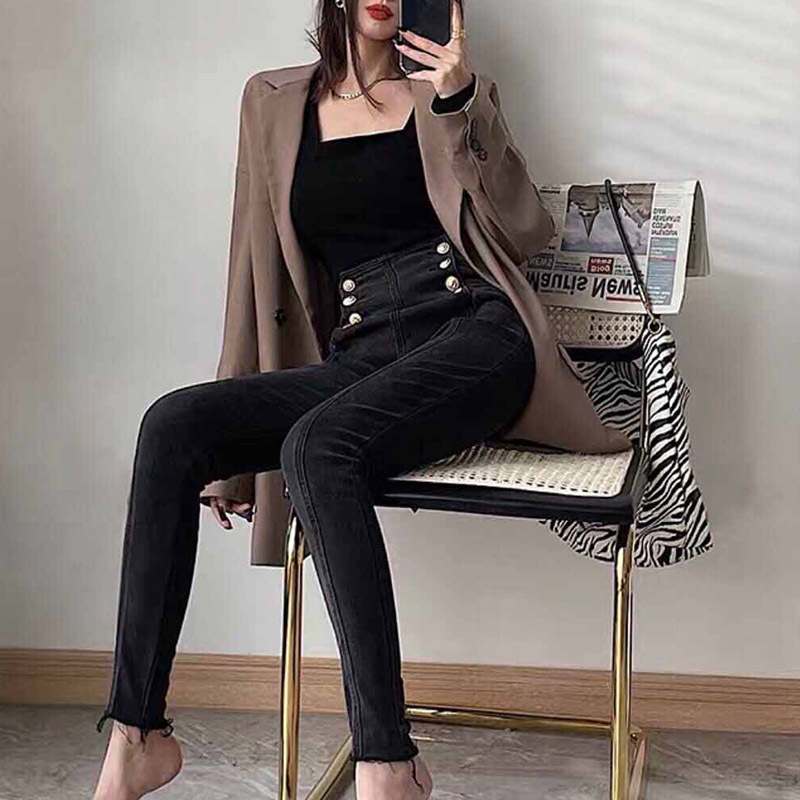 22 High Street Elasticity High Waist Buttons Jeans Women Luxurious Double Breasted Grey Denim Trousers Tight Pockets Black Jeans