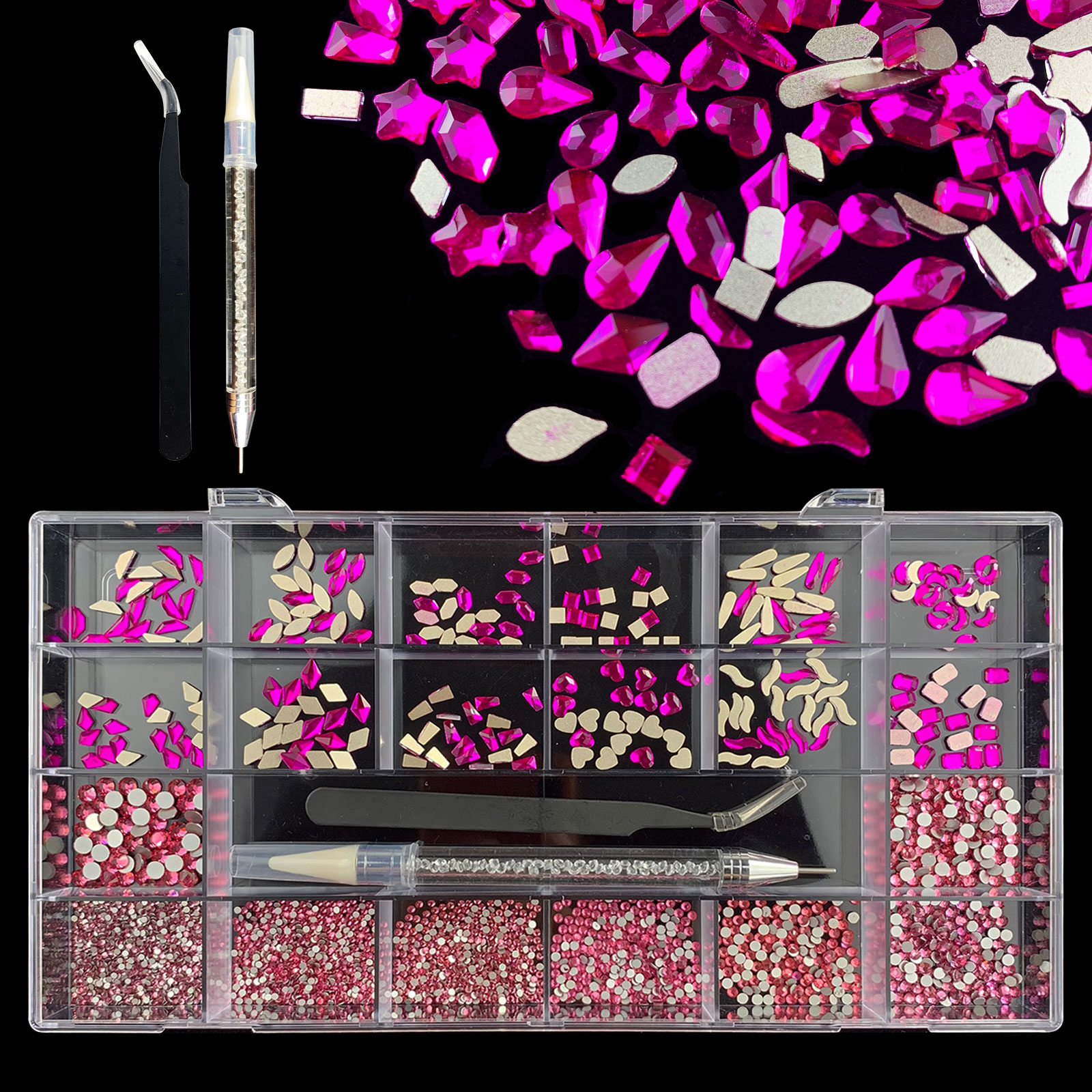 3). 3100pcs Rhinestone set: 480pcs(20x24) k9 crystal glass rhinestones, 2500pcs mix sizes round rhinestones,1pcs wax pen(Crystal or white), 1pcs tweezers for free