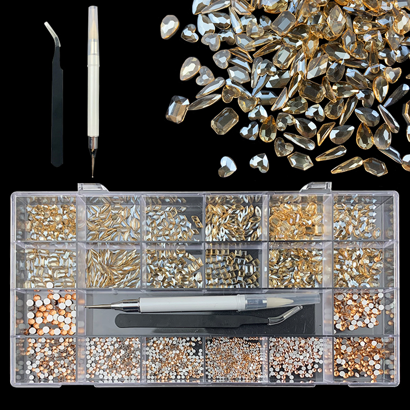 1). 2500pcs Rhinestone set: 300pcs(25x12) k9 crystal glass rhinestones, 2200pcs mix sizes round rhinestones, 1pcs wax pen(Crystal or white), 1pcs tweezers for free