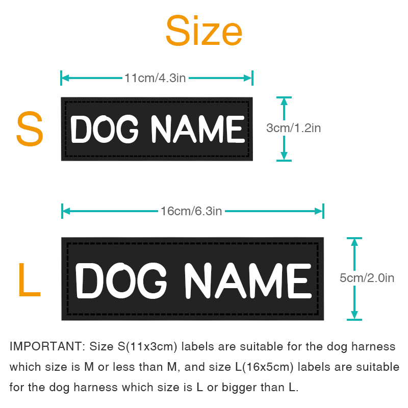 16x5cm(6.3x2.0in) size labels are suitable for the dog harness which size is L or bigger than L.
