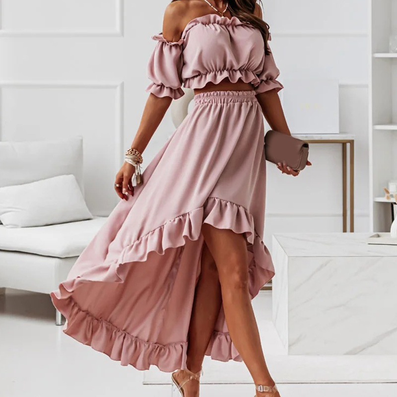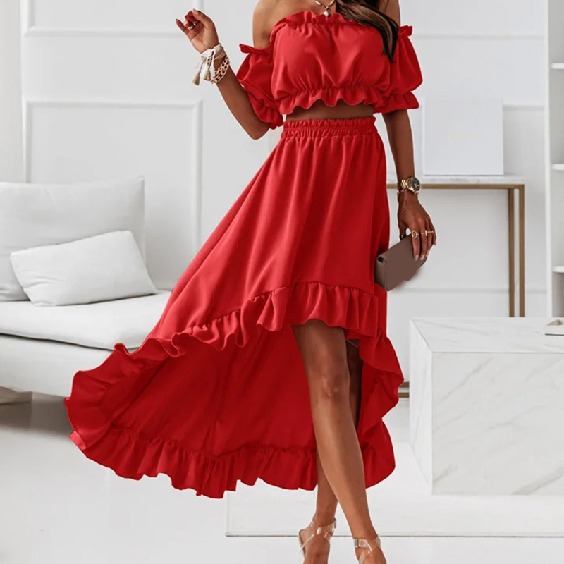 2PCS Set Ruffle Crop Tops Maxi Skirt Set Summer Women Dress Sexy Off Shoulder Dress Suit Women Frill Short Sleeve Dress Suit