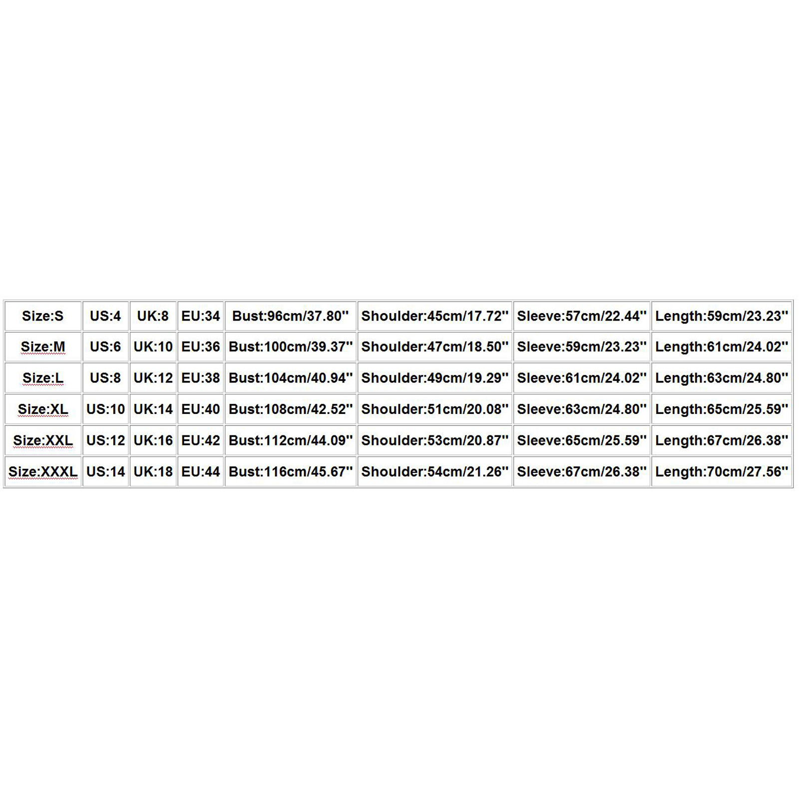 Size US UK EU Sleeve Shoulder Bust Length