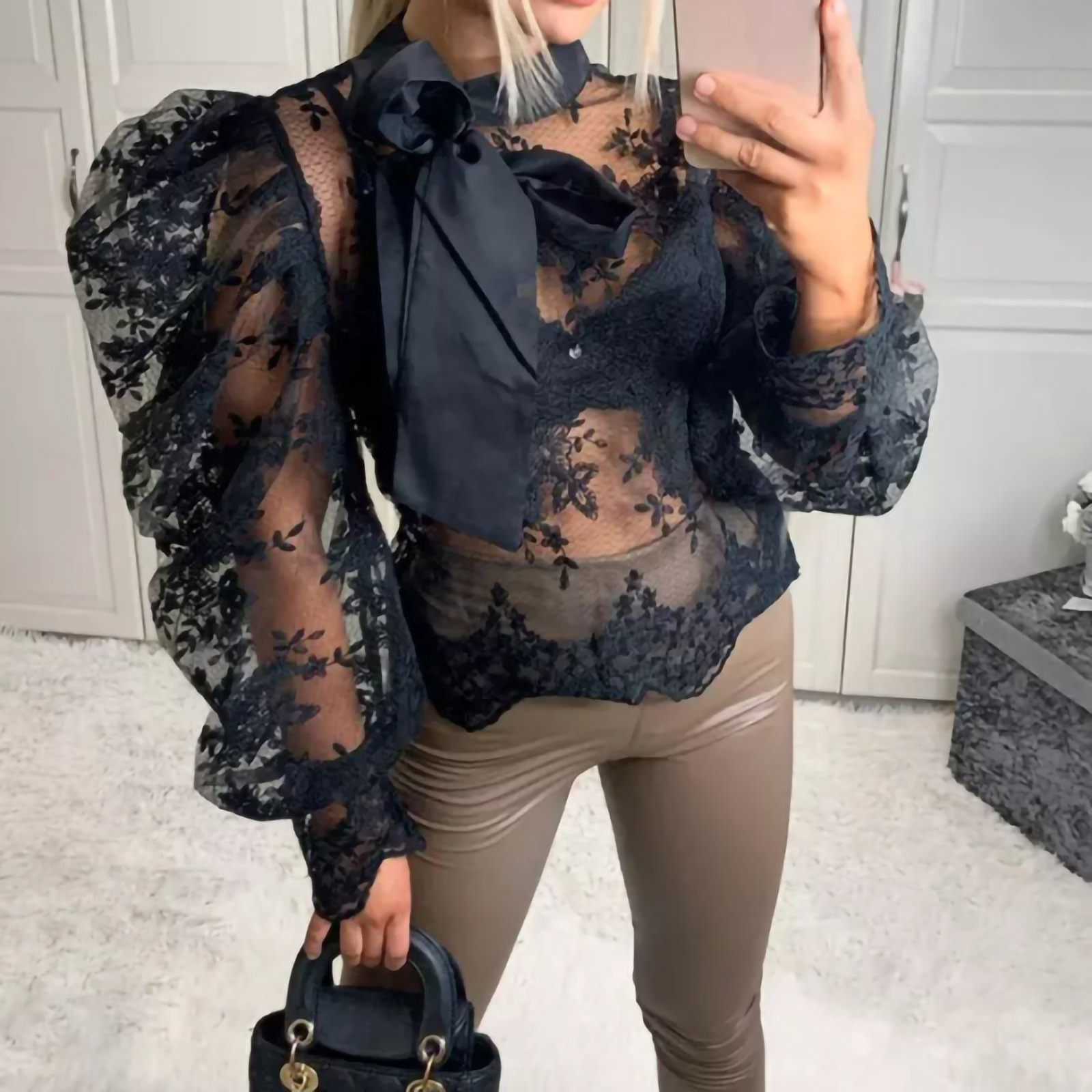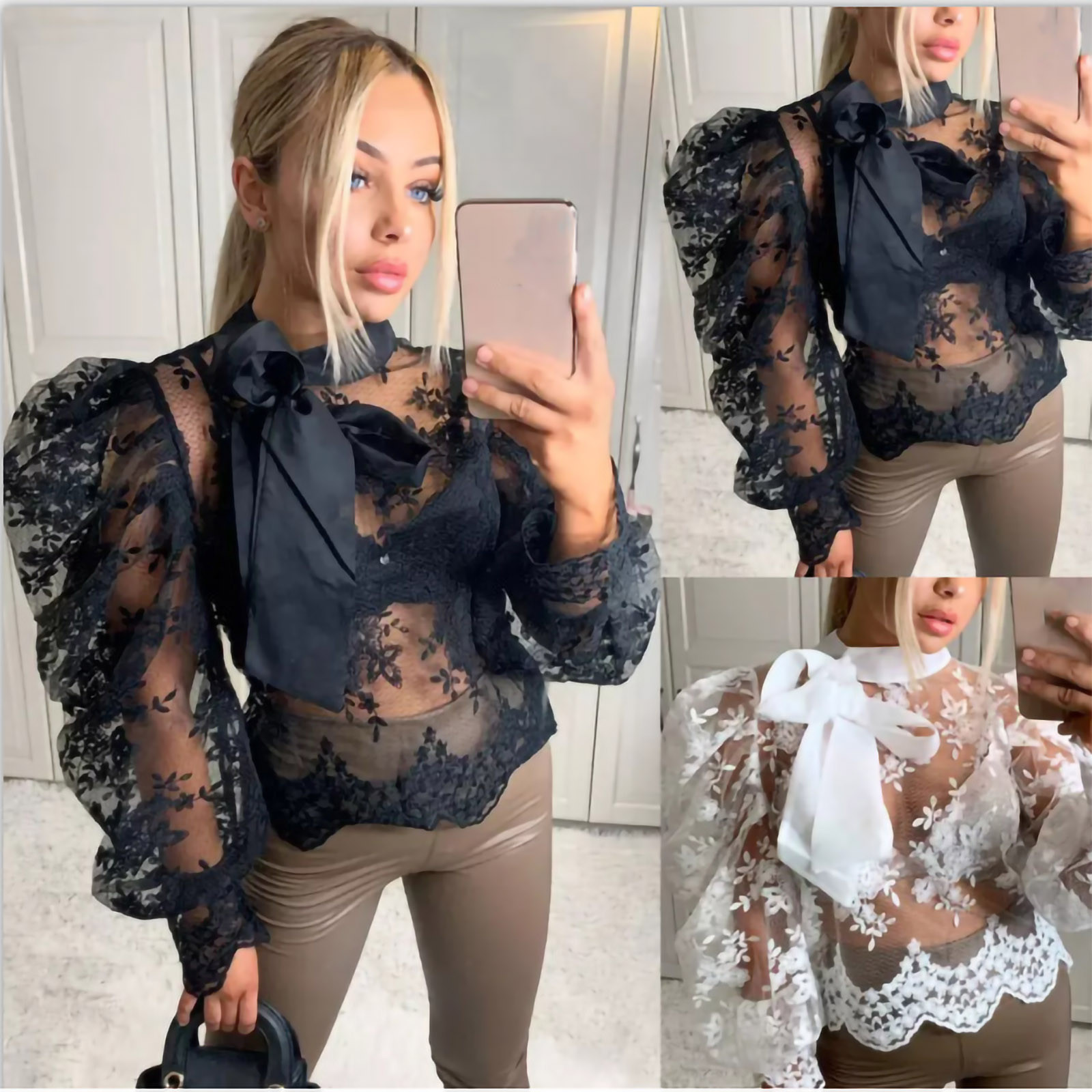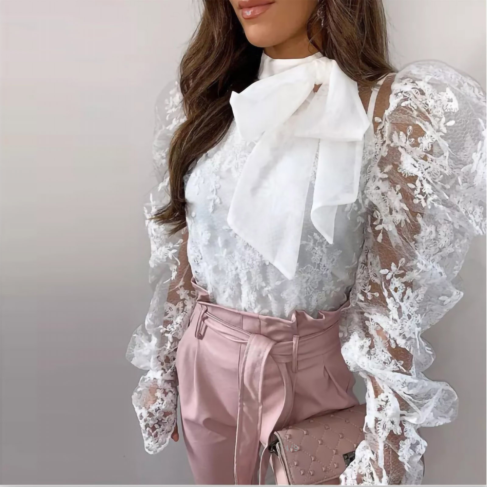 40# Women Blouse Hollow Out Long Sleeve Turtleneck Mesh Lace Bow Sexy Blouse Drawstring Ruched Sweater Tops Блузка С Кружевом