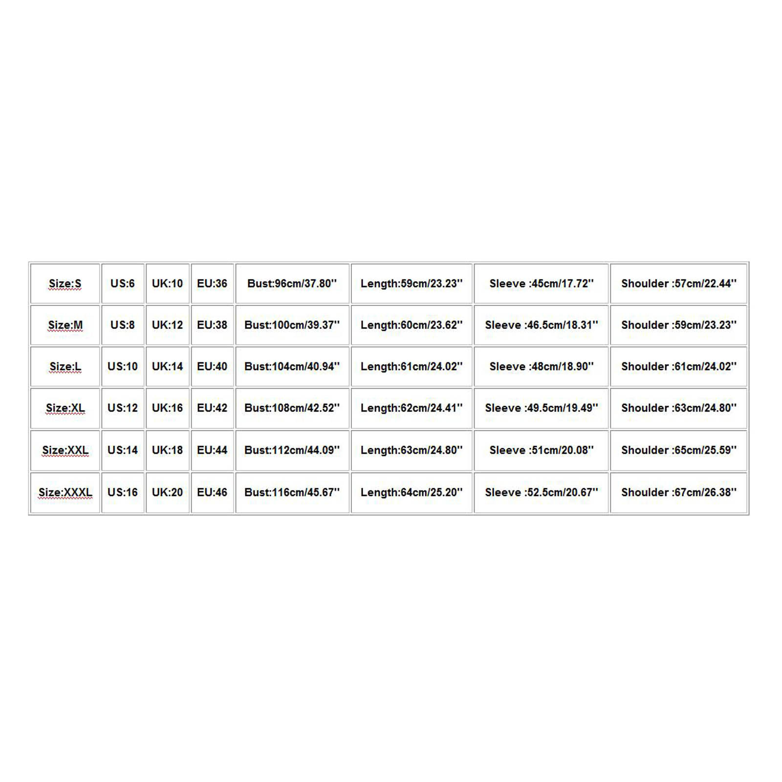 • Size US UK EU Bust Length Sleeve Shoulder