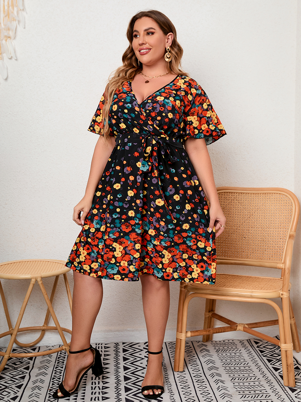 4XL 5XL Plus Size Summer Dress Woman V Neck Short Sleeve Floral Print Short Mini Dress High Waist Beach Dresses