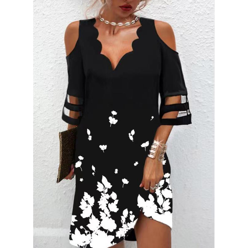 Autumn Summer Women's Wave V Neck Mesh Splicing Half Sleeve Dress Casual Loose Floral Elegant Knee-Length Dress New