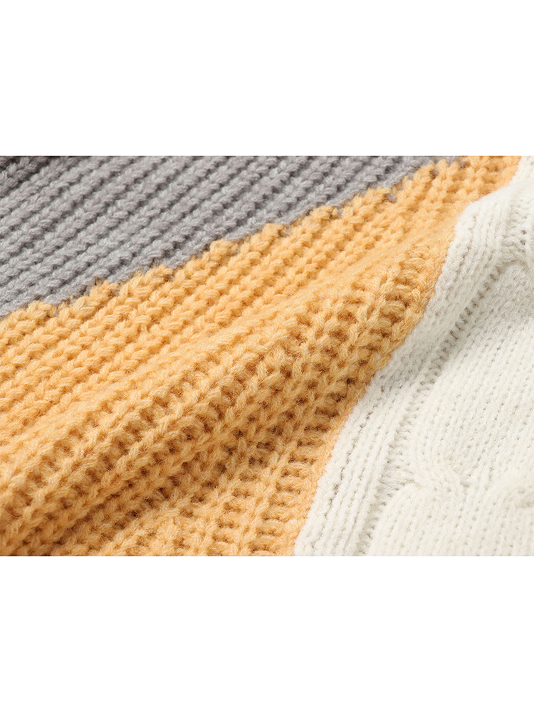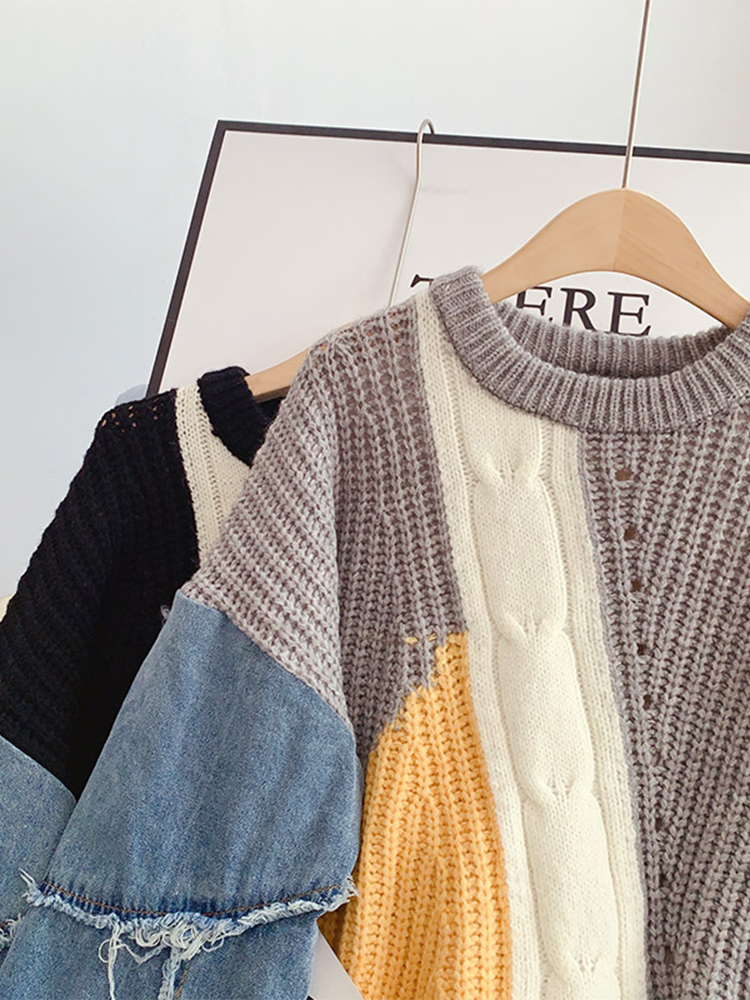 Autumn Winter Women Crew-neck Contrast Color Knitwear Jumper Sweater Loose Long Sleeve Patchwork Tassel Knitted Pullover