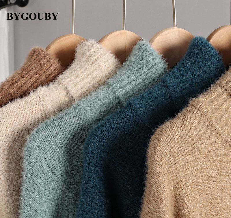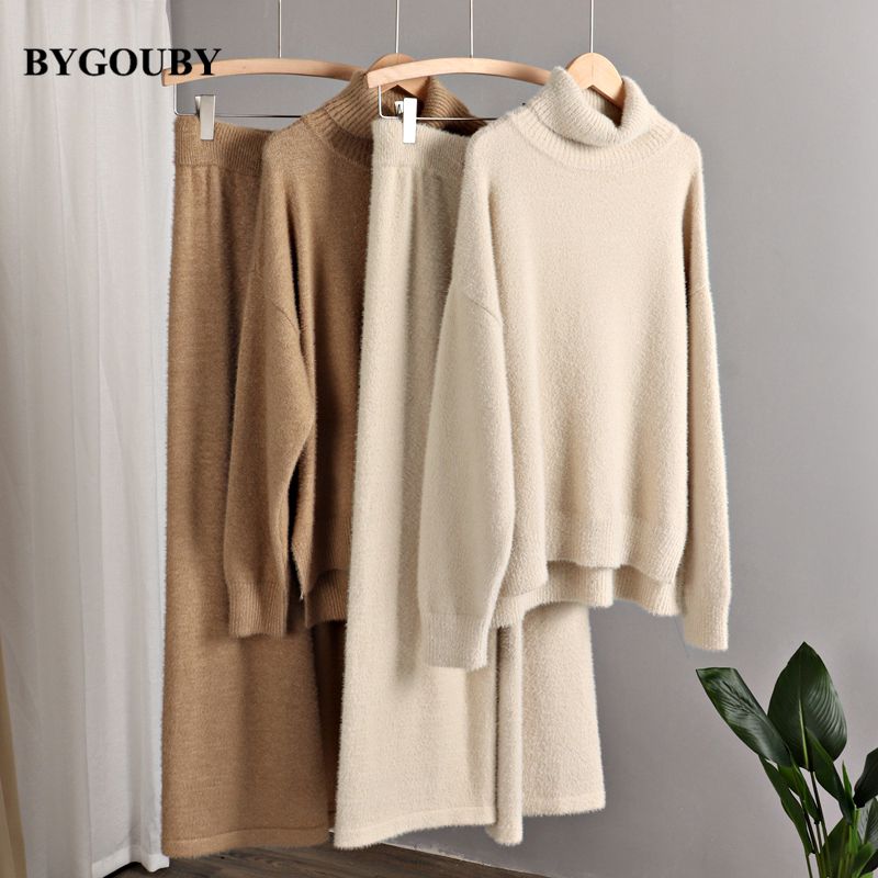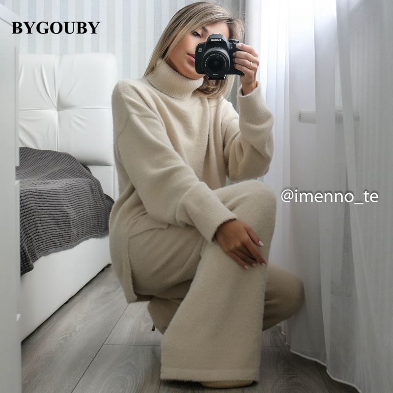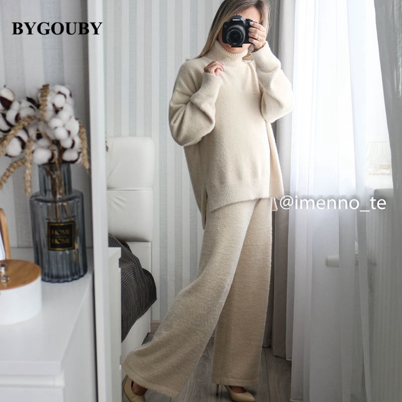 BYGOUBY Oversized Women Cashmere Sweater Winter Thick Warm Turtleneck 2 Pcs/Pieces Tracksuits Wide Leg Pants Suits