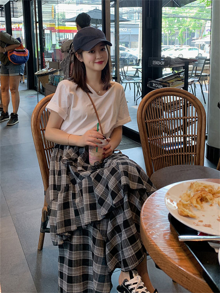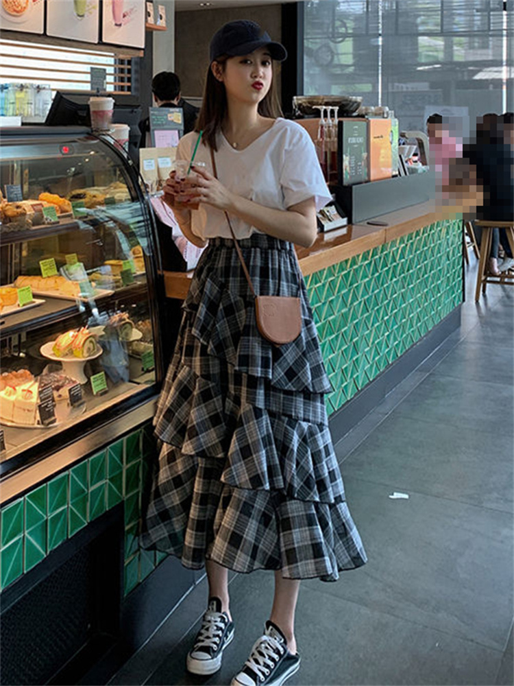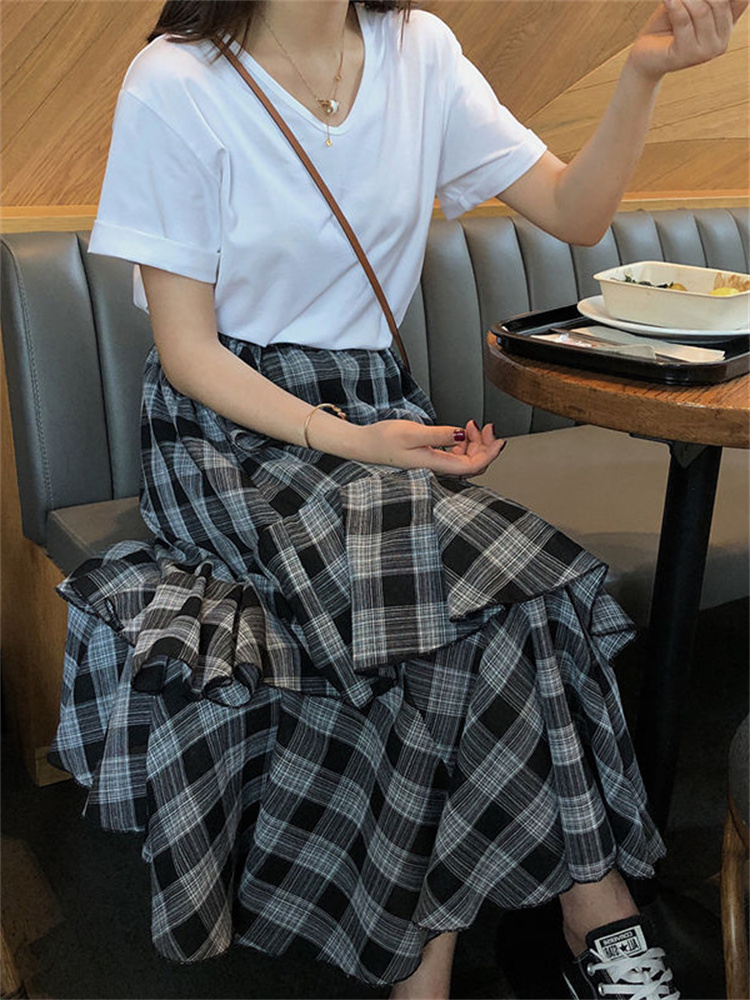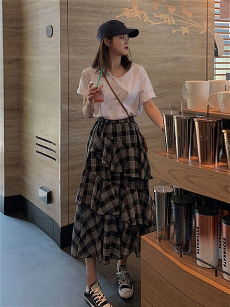 Casual Summer Vintage Plaid Skirt Women Elegant Chic Asymmetrical Patchwork Ruffles Long Skirt High Waist A-line Skirts