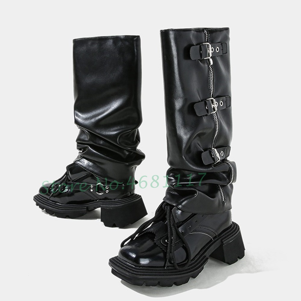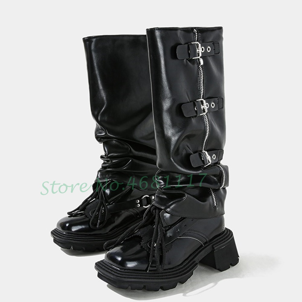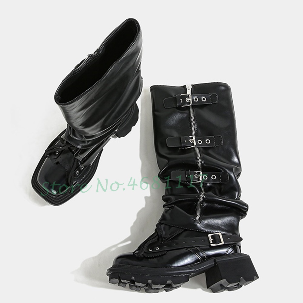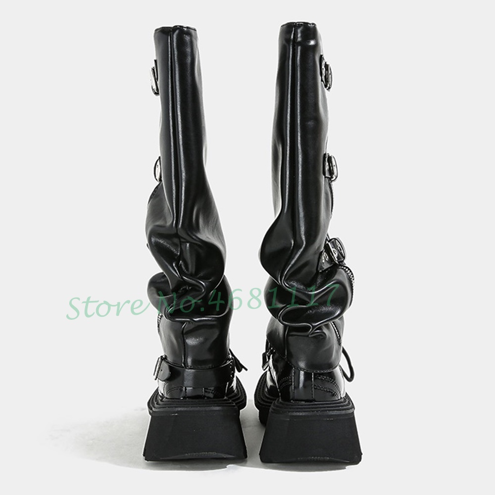 Cool Black Biker Knee High Boots Women Trend Metal Belt Buckle Sleeve Boots Platform Chunky Heels Zipper Designer Winter Boots