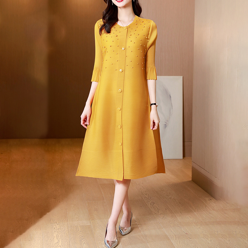 Creatingtime Printing Pleated Dresses For Women Stand Collar Long Sleeve Buttons Lace Loose Clothing Summer LH449