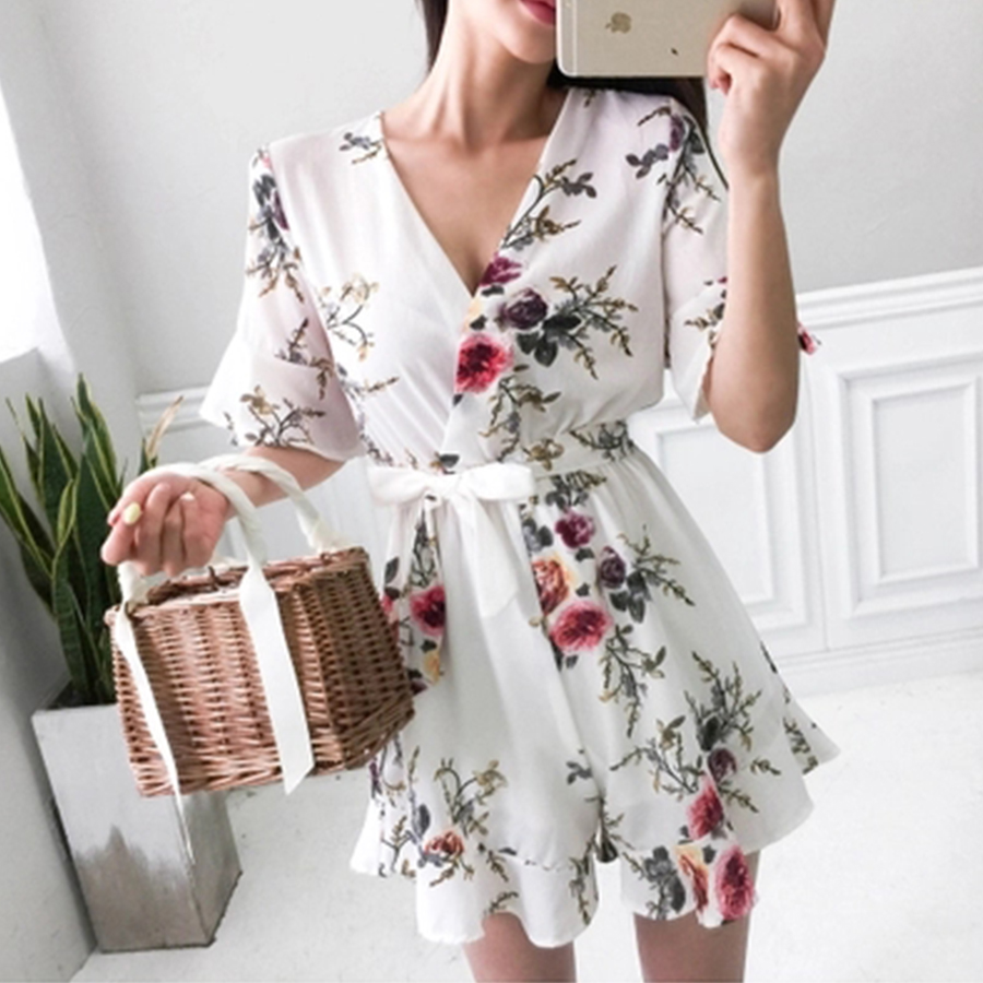 Features: Flower Chiffon Sexy Jumpsuit Women V-Neck Print Beach Playsuit Female Short Overalls Jumpsuit Casual Boho Bodysuit