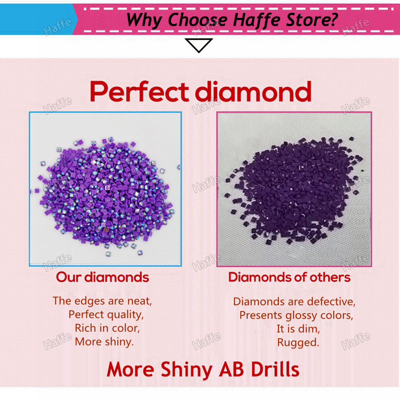 【Unique AB Diamond】:Original ordinary diamond cutting surface laser technology, showing shiny color. In the diamond painting, AB diamonds are used to embellish and make the diamond painting more shiny!