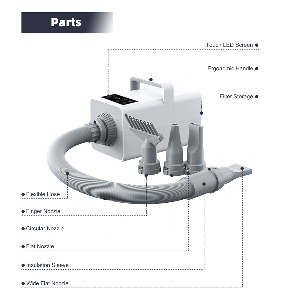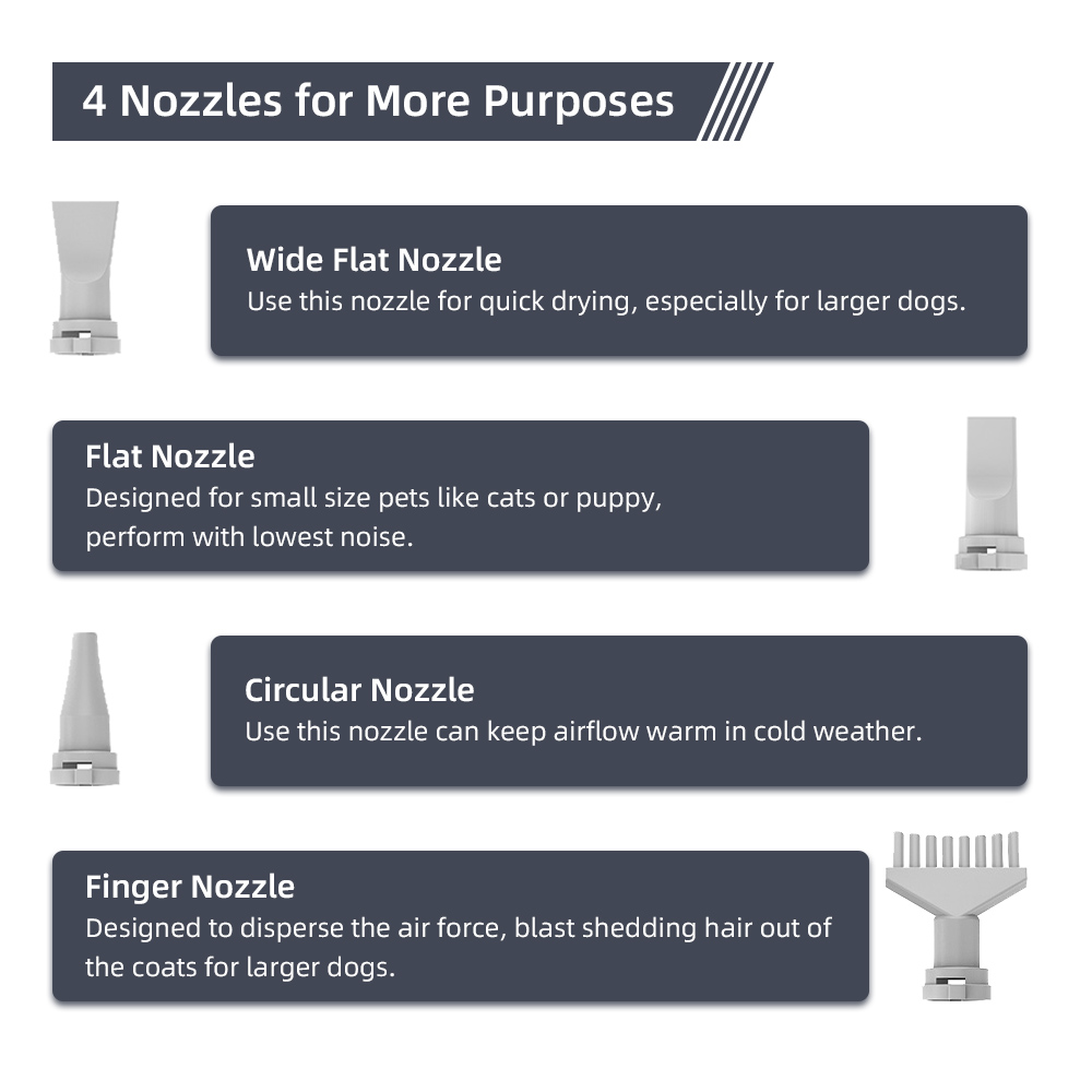 【4 NOZZLES & SPRING HOSE】The hose can extend from 0.55m/1.8ft to 2.3m/7.5ft. Comes with 4 different nozzles to satisfy all drying demands and to make shiny hair for dogs. Very handy to use.