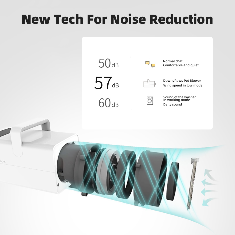 With noise reduction device, this dog grooming dryer can effectively reduce noise, lower than 57 db at low mode wind speed, which won't scare dogs.
