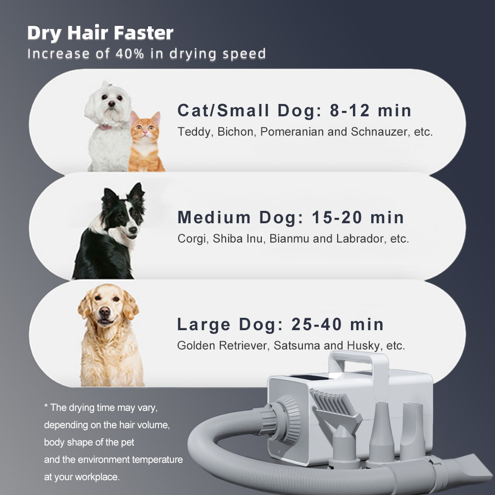 * The drying time may vary, depending on the hair volume, body shape of the pet and the environment temperature at your workplace.