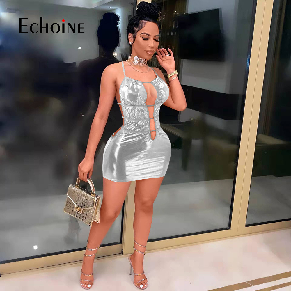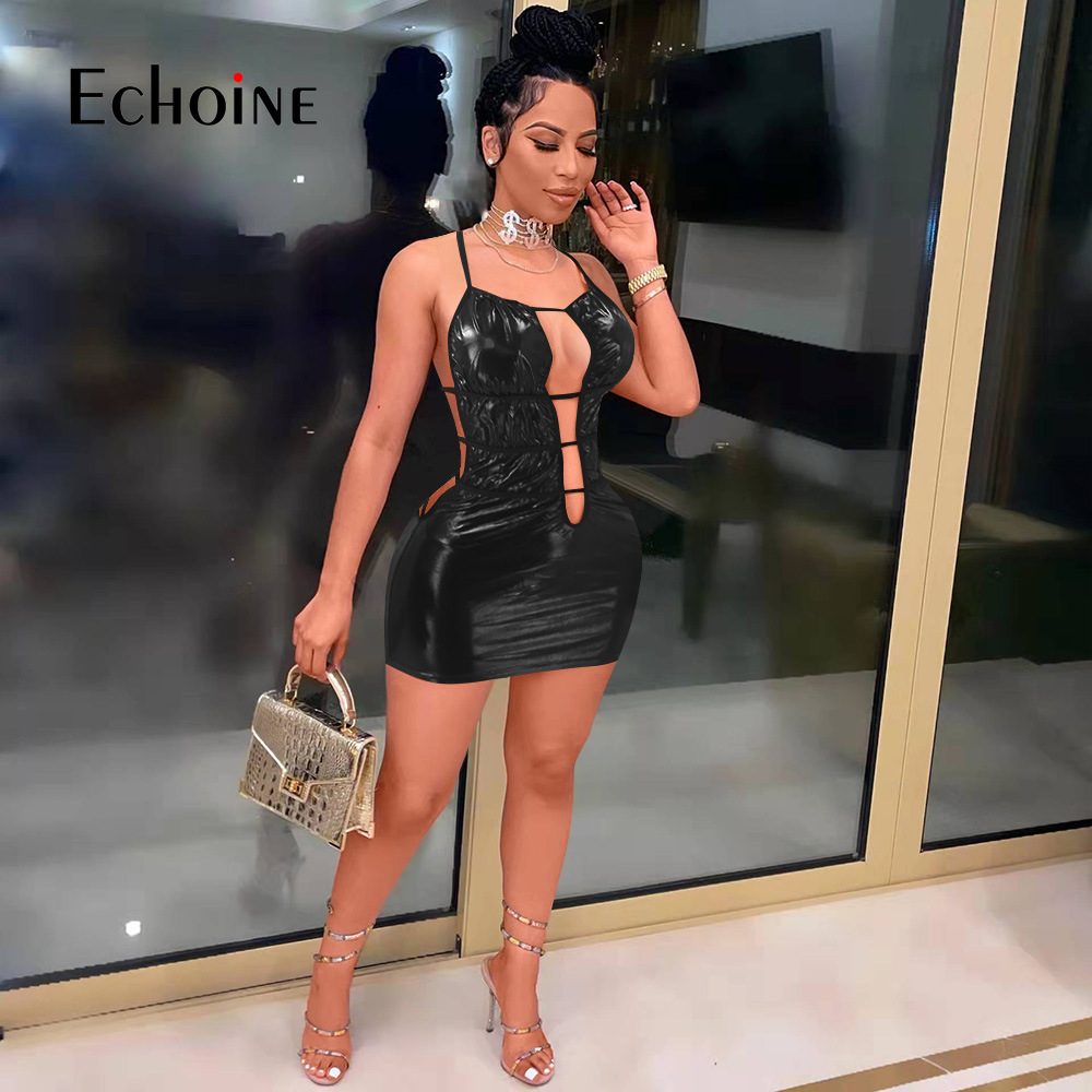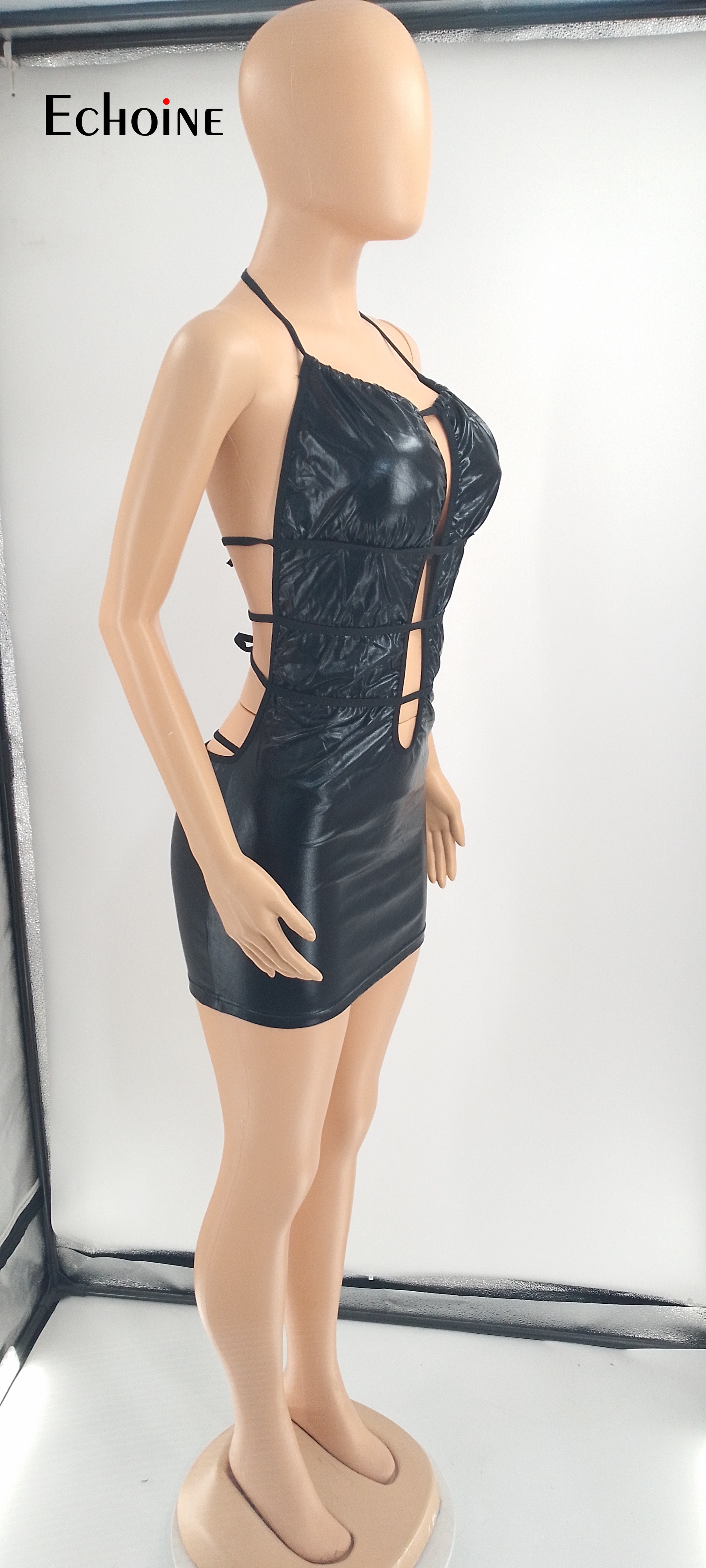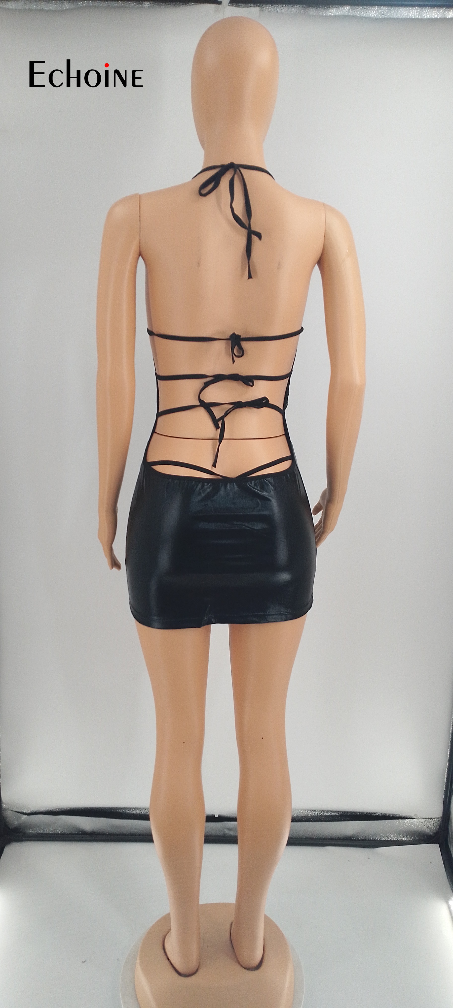 Echoine Spring PU Faux Leather Stretch Solid Mini Dresses Woman Nightclub Halter Sexy Backless Straps Short Dress Thong