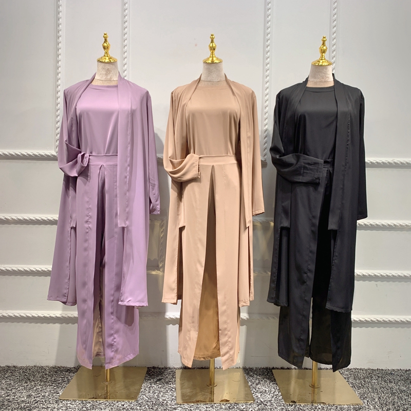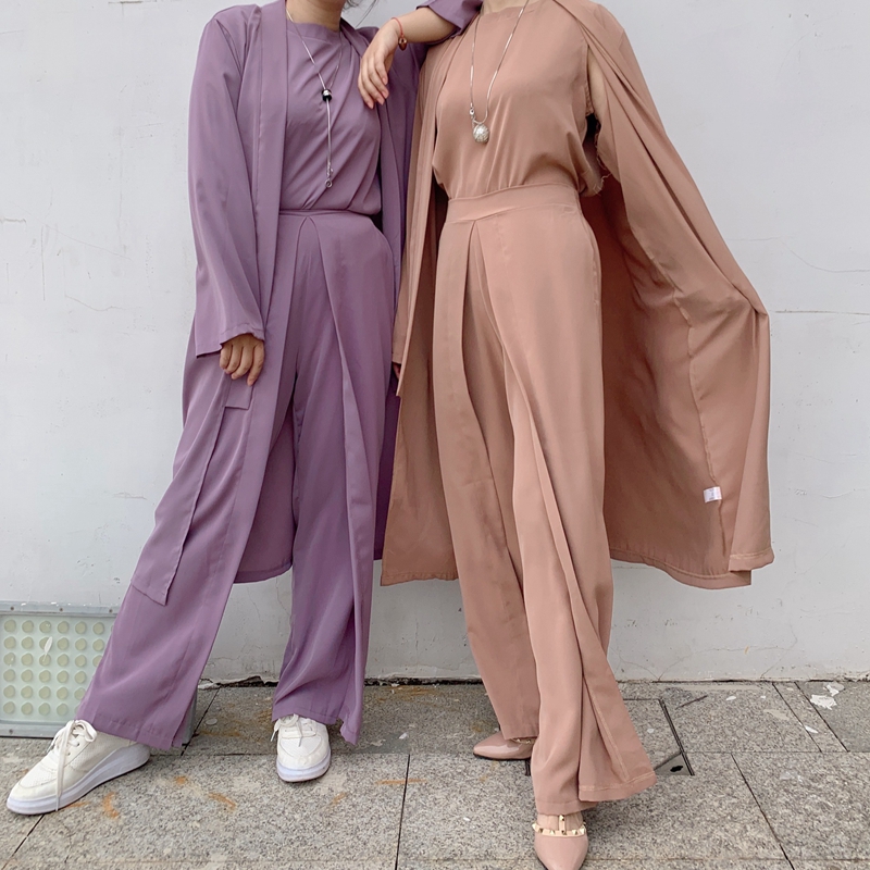 Eid Plain Women Tops With Pants ArabicTurkish Women Clothing 3 Piece Matching Set Muslim Kimono Abaya DubaiModest Outfit