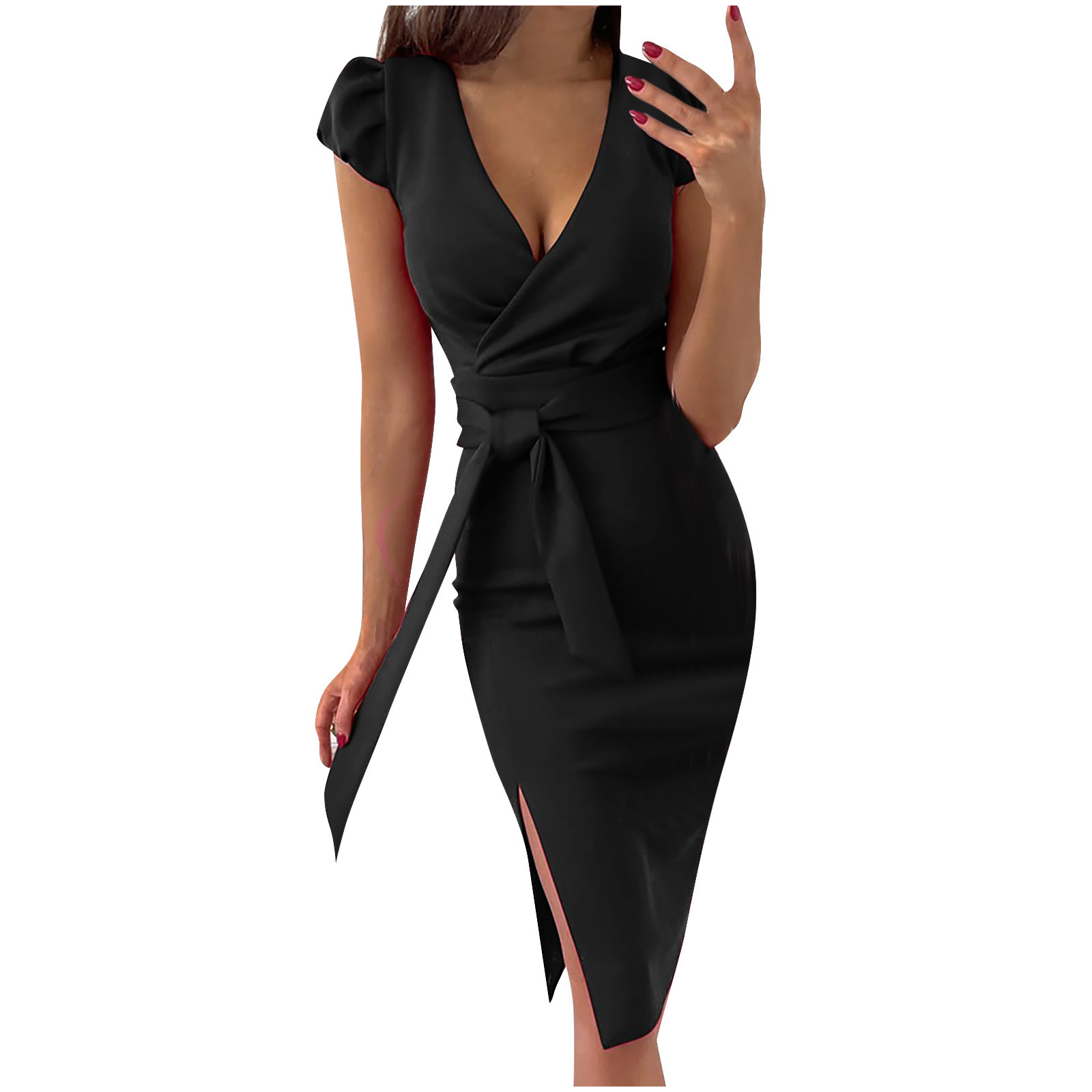 Elegant Office Lady Formal Pencil Dresses Summer Women's V-neck Short Sleeve Bodycon Party Dress Solid Oversized Clothing