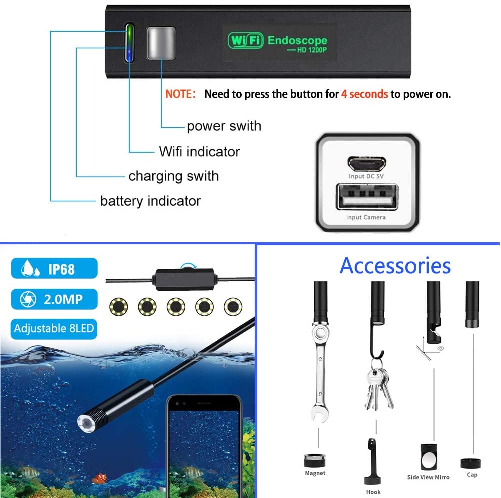 1.【The Newest Type Endoscope】:Unlike other endoscope camera on the marketplace, this wireless wifi endoscope camera not only work with Android smartphone(Above Android 2.3), but also iPhone IOS system(Above IOS 6.0). This is perfect for iPhone user who want do inspection work. Without using extra adapter or cable, it can be easily connected with your smartphone via WIFI. The only thing you need to do is to download and install the compatible APP "WIFI look"on your device.