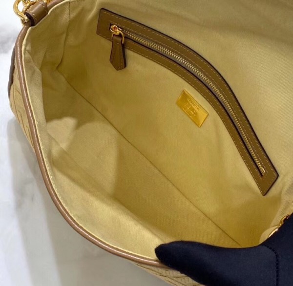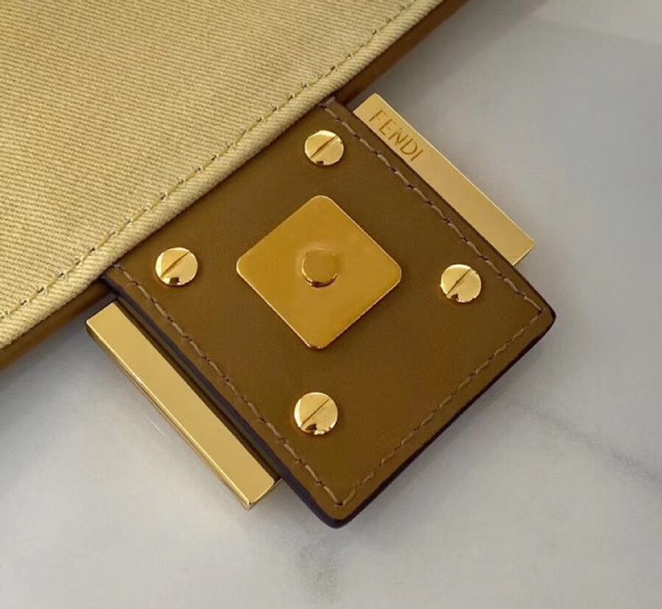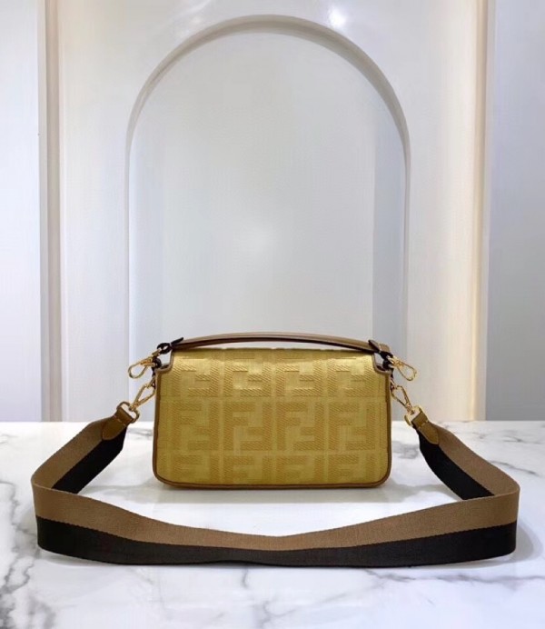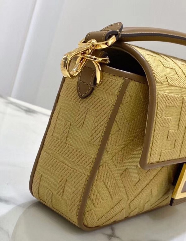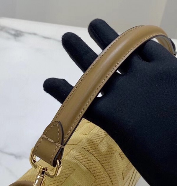 Iconic Baguette bag in medium size, with flap and FF fastening with magnetic clasp. Lining with zip pocket. Can be carried by hand or worn cross-body thanks to the handle and shoulder strap, both detachable. Made of natural straw. Decorated with the FF motif embroidered in tone on tone thread. Edges finished with brown leather trim. Ribbon shoulder strap with Pequin motif.
