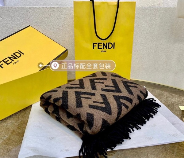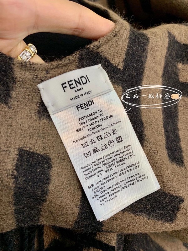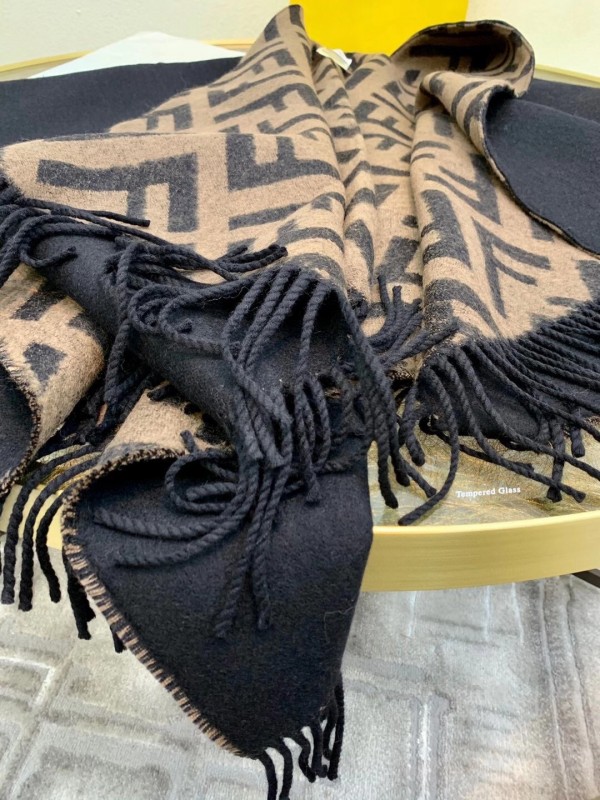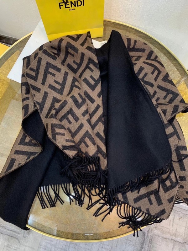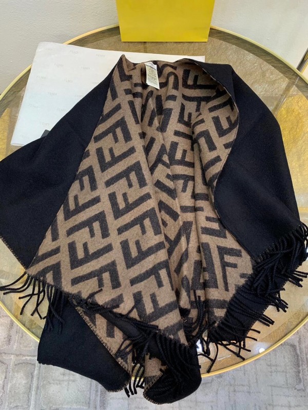 Large wraparound reversible poncho made from cashmere and wool. One side is embellished with the macro FF motif in shades of brown, while the other is plain black in colour. Finished with fringes at the hem.