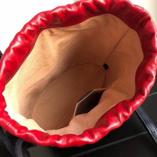 Inspired by archival designs, Gucci 1955 Horsebit bucket bag unifies the original details first introduced over six decades ago with a modern spirit, highlighting the Horsebit. Part of Gucci’s genetic code, the double ring and bar design has been established as one of the most distinctive elements among the House symbols borrowed from the equestrian world. The hardware is paired with a contemporary mix of materials and colors, combining textured blue leather with soft red leather to create a color block effect.