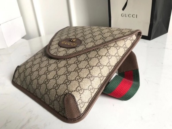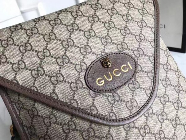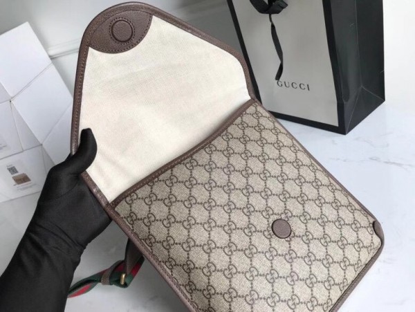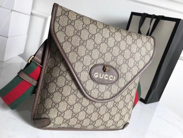 The medium messenger bag is part of a collection of vintage inspired leather accessories in GG Supreme featuring an oval leather tag with metal feline head, a now-established code of the House. The slim design has a magnetic flap closure and is completed with an adjustable nylon strap featuring the House Web colors.