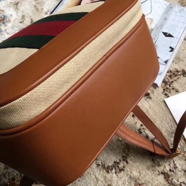 The classic backpack shape blends vintage appeal with traditional House codes in a softly structured shape. The distinctive Web is presented against beige canvas—a bi-colour woven fabric with a slight aged effect that enhances a vintage appearance. The rectangular shape is trimmed with leather and a small Interlocking G in gold-toned metal. New shapes and signature Gucci lines are reimagined in a mix of fabrics and trims imbued with an inherently summer feel.