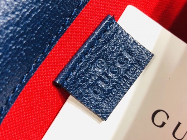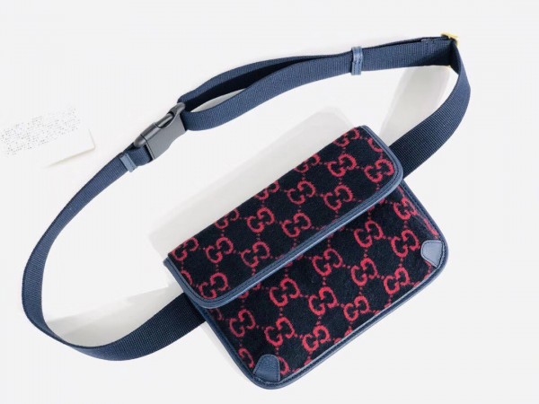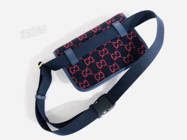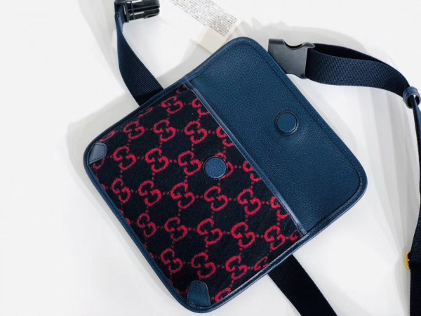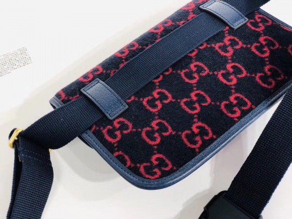 The belt bag is presented in blue and red GG wool—a contemporary interpretation of the original 1930s design, the distinctive fabric is displayed throughout the Cruise 2020 ready-to-wear and accessories. Trimmed with textured blue leather, the rectangular shape has a magnetic flap closure and an adjustable Web strap.