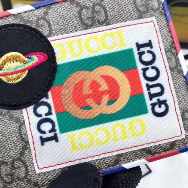 Travel continues to be a source of inspiration for Alessandro Michele. A collection of accessories in the GG motif is enriched with a blend of contemporary embroideries-like the UFO-and vintage inspired details, including airmail trims and a Gucci vintage logo from the archives. The appliqués are individually embroidered and then skillfully hand-applied to each piece by specialized artisans. This process ensures that no two items will be alike, giving each a one-of-a-kind appearance.