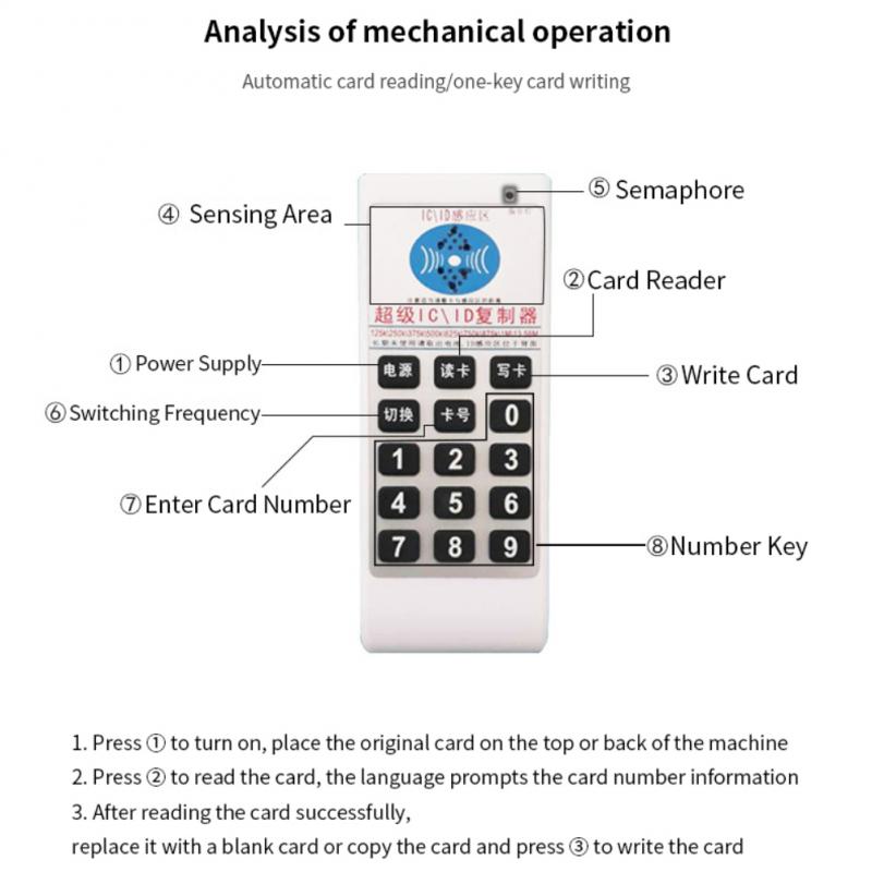 Note: Due to screen printing errors, this machine supports reading and copying of unencrypted M1 cards of IC and unencrypted cards of ID, such as 125Khz, 250Khz, 375Khz, 500Khz, 13.56Mhz (ic mode), etc., while encrypted cards, HID cards and cards with power supply cannot read and copy.