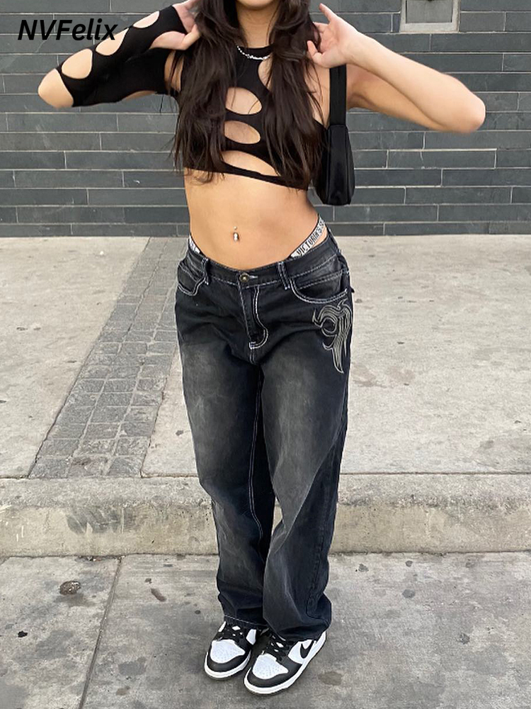 Harajuku Printed Cargo Jeans Y2K Dark Blue Brown High Waist Streetwear 90S Baggy Trousers Women Pants Straight Wide Leg Pants