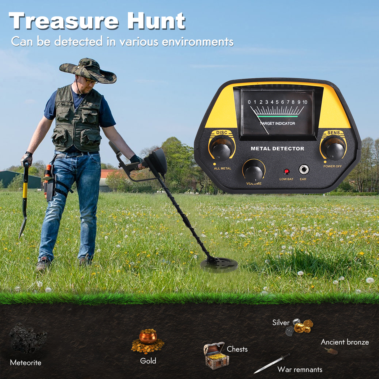 With this metal detector, you can hunt for coins, relics, jewelry, gold, and silver just about anywhere, including lawns, snows, mountains and etc.