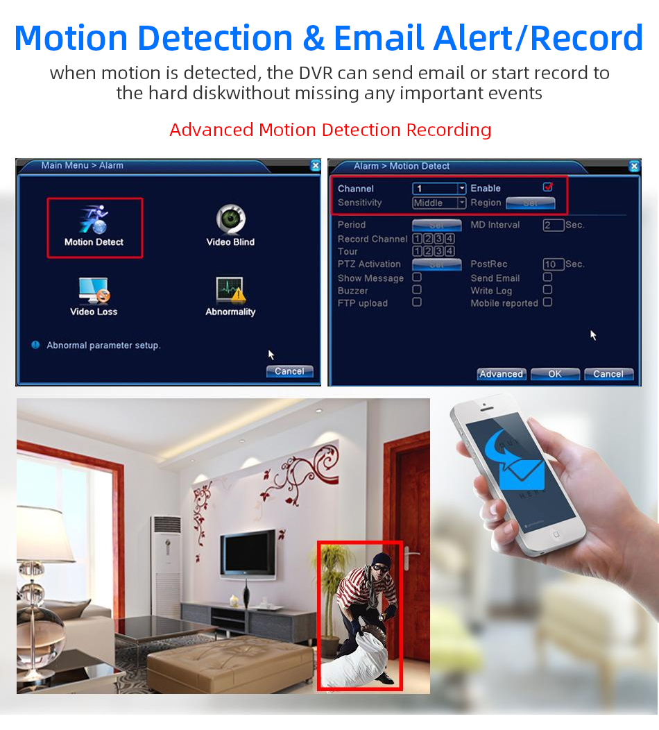 when motion is detected, the DVR can send email or start record to the hard diskwithout missing any important events