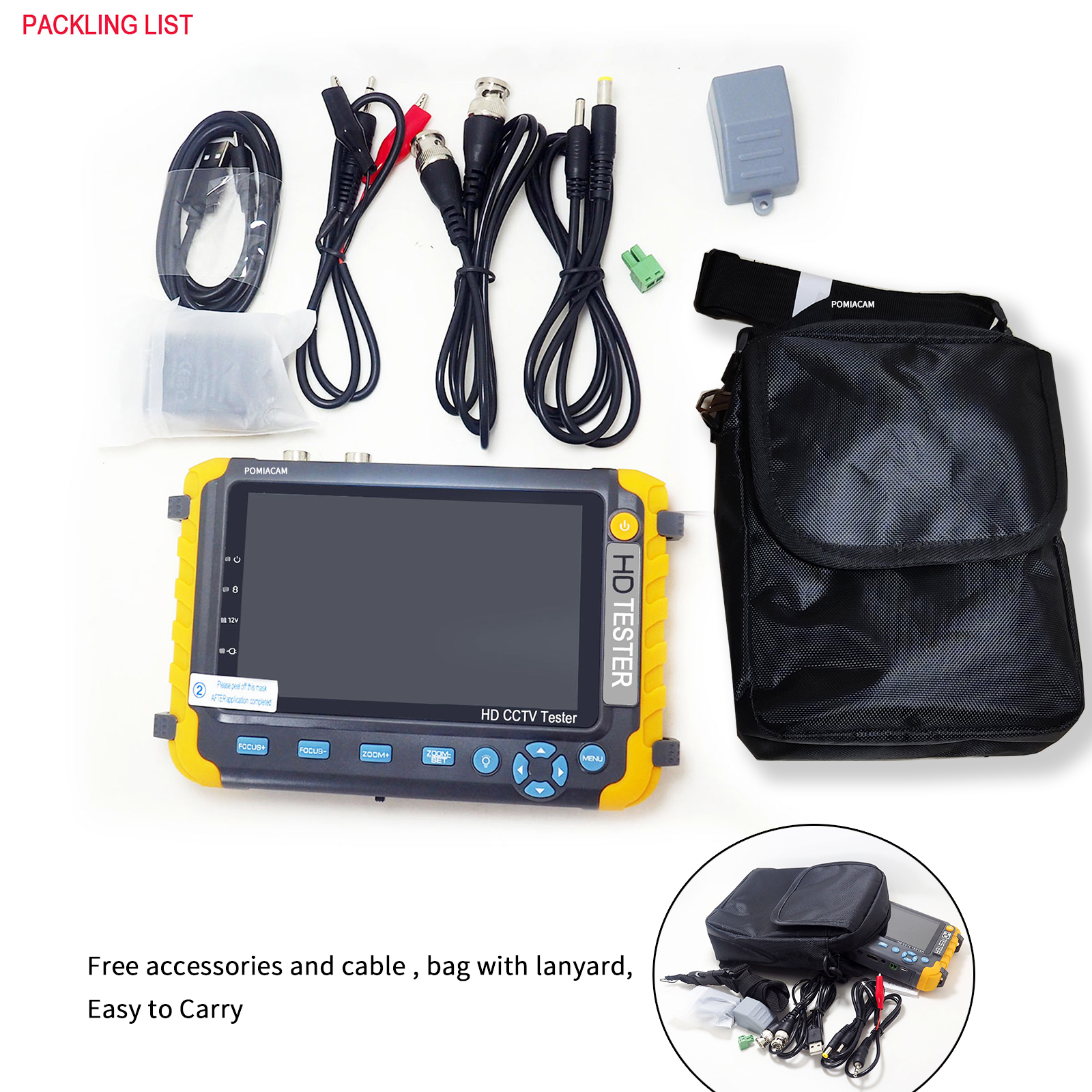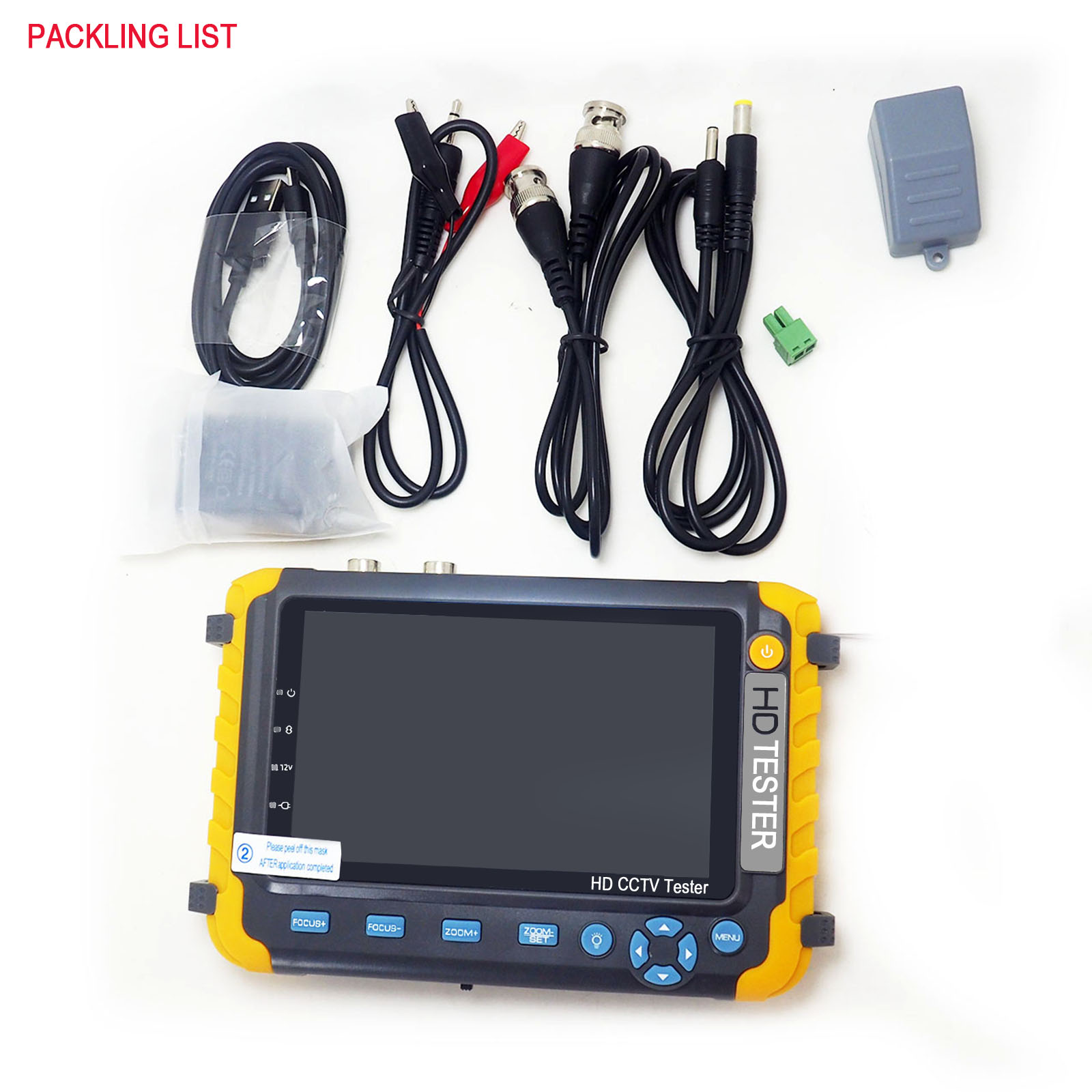 (Yellow CCTV tester monitor)8W,---------------------------1. Support CVBS + AHD (8MP) + TVI (8MP) + CVI (8MP) Camera Test,with VGA/HDMI input. 4-In-1 CCTV Tester Monitor.5.0 inches 800 x480 High-resolution view angle display, more intuitive and easy to display the camera image quality, support PAL/NTSC standard video signal.