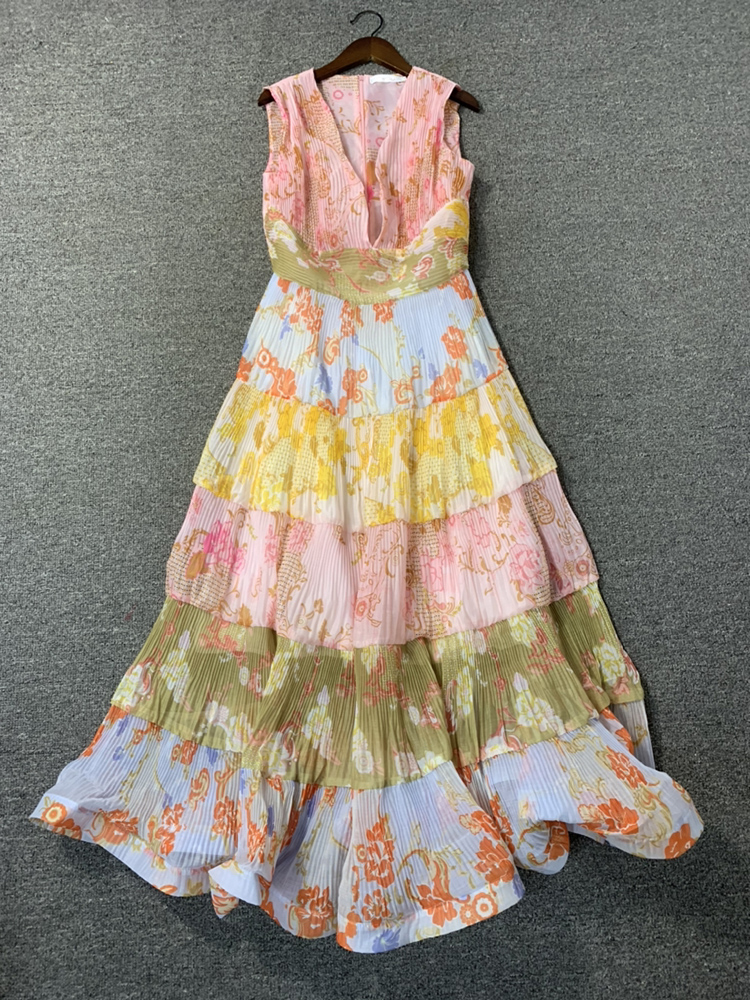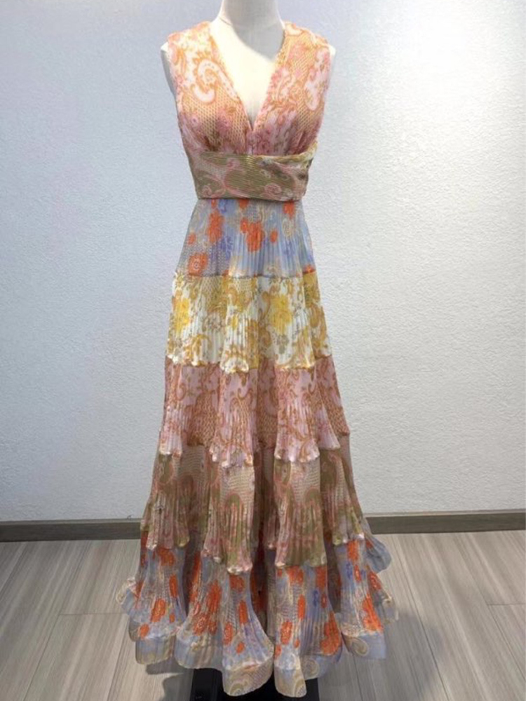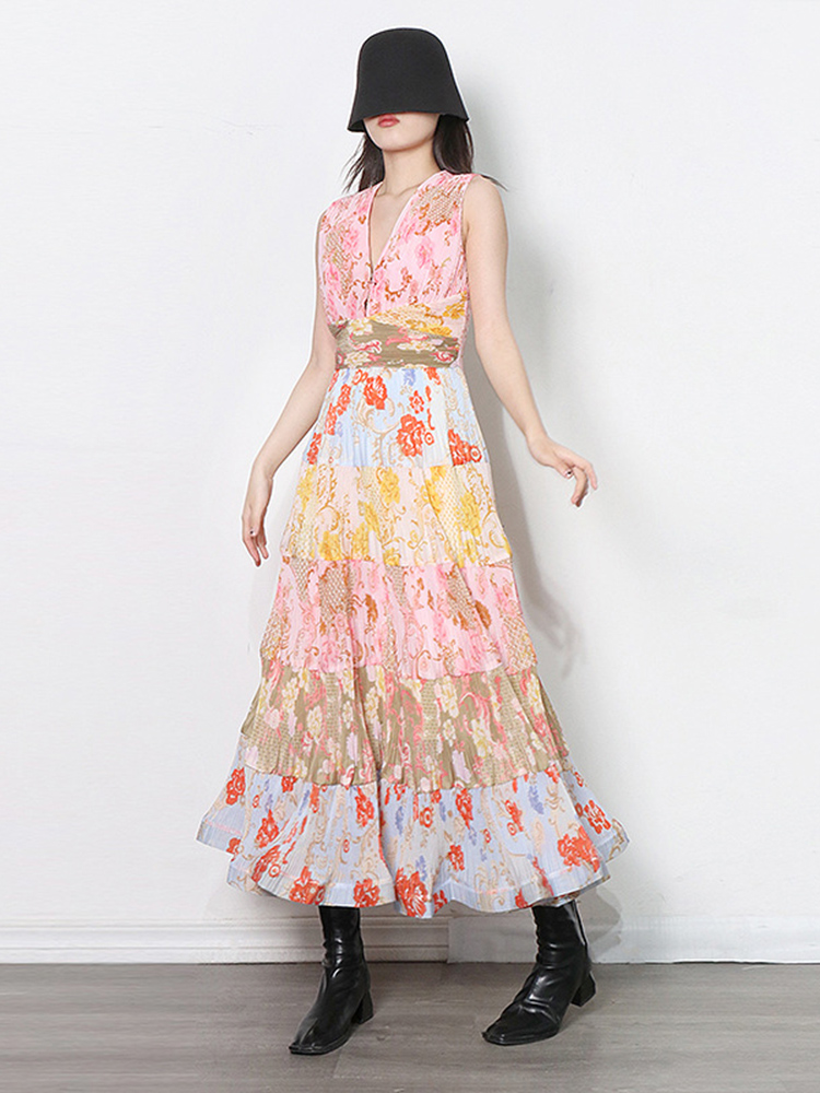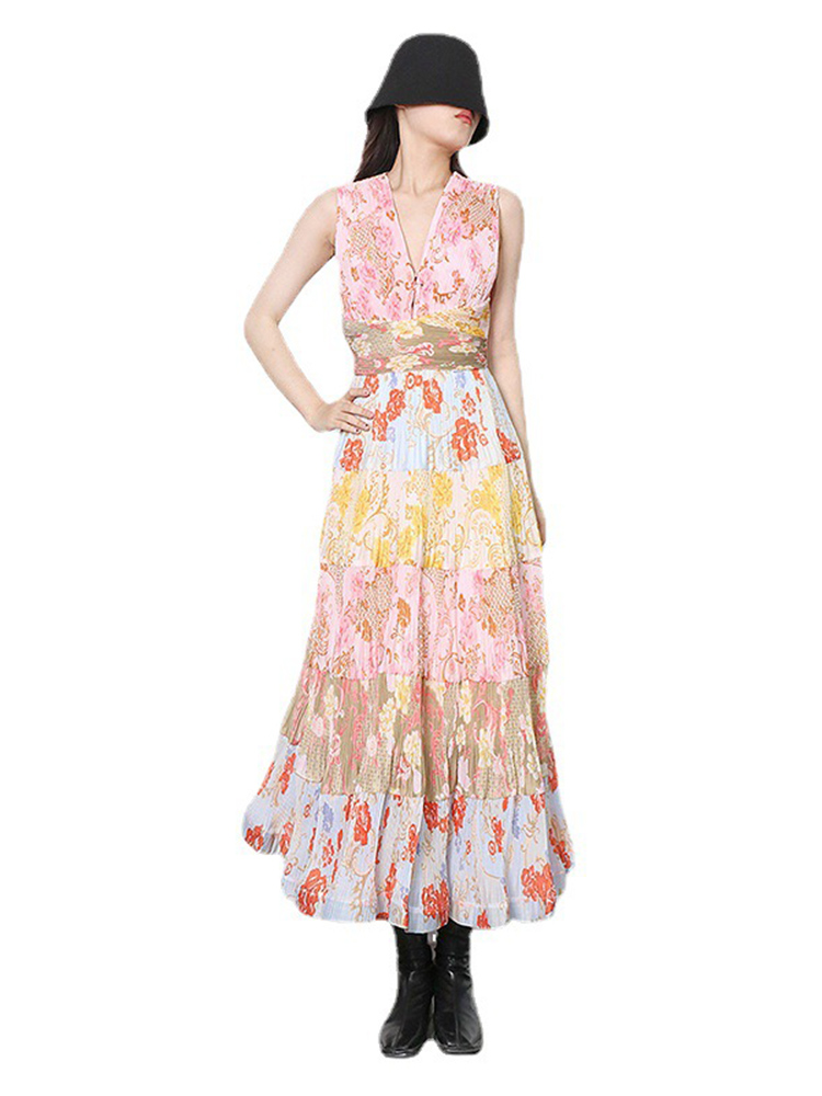 JUNLINNA Summer Women Bohemian Dresses Sexy V Neck Sleeveless Printed Rufflies Party Holiday Long Vestidos Waist-closing