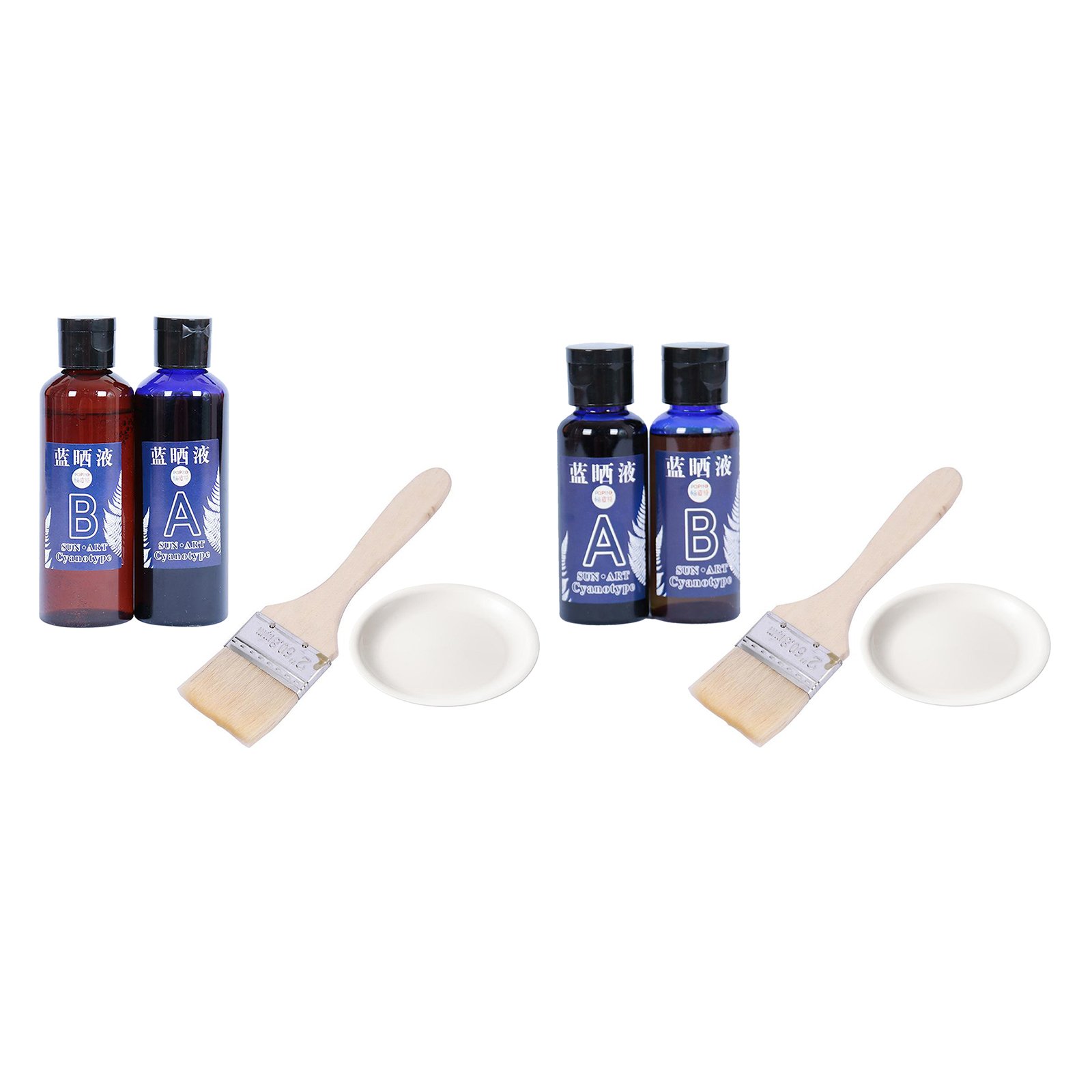 Pre-measured cyanotype chemicals and SIMPLE STEP-BY-STEP INSTRUCTIONS. Complete with a set of brushes, palette, straws, gloves and apron for easy application.