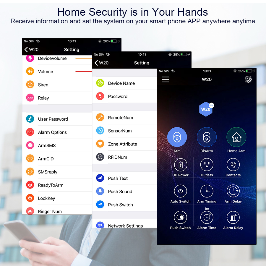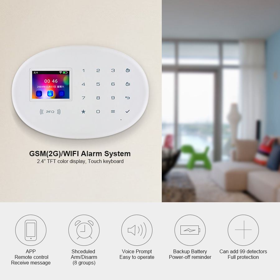 Compatible with wireless PIR sensor, door sensor, smoke detector, gas detector, panic button etc. It has been widely used in home, factory, school, shop, villa and residential area to provide protection for valuable assets