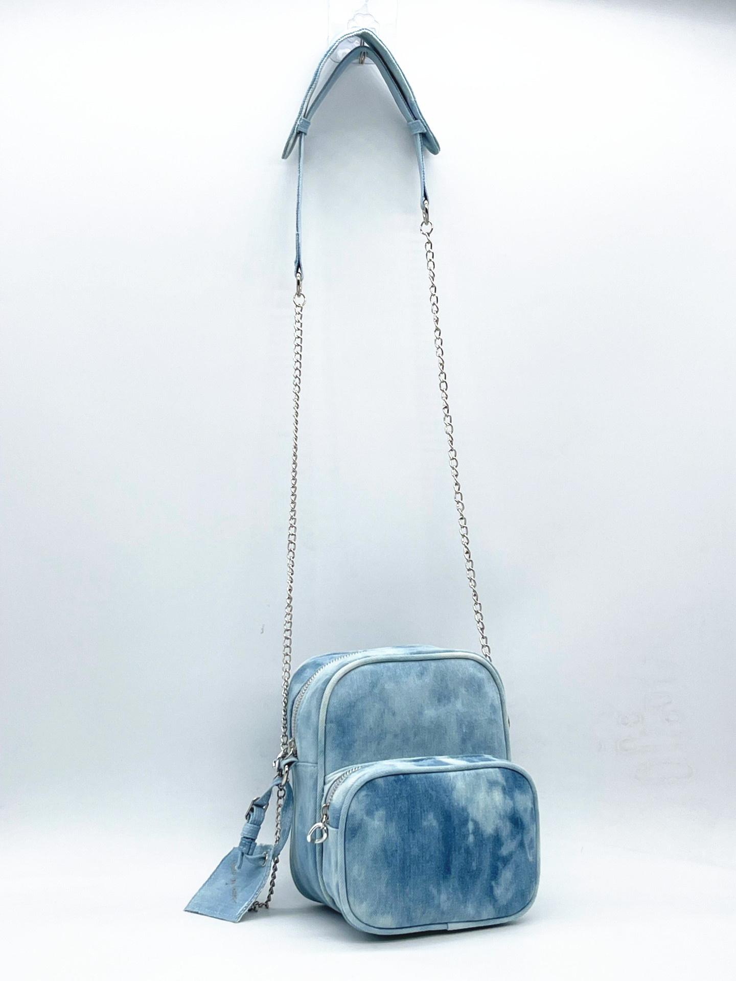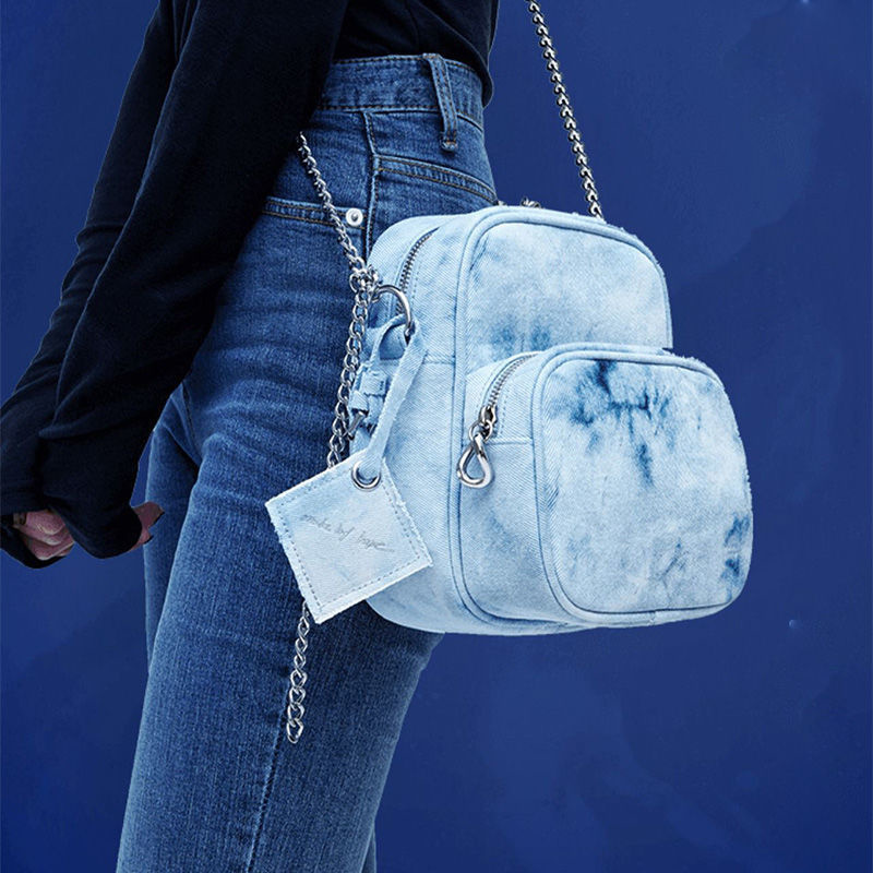 The bag material is denim, tie-dyed by hand, and the color of each bag will show different effects. The overall color trend is blue, and the quality is very good. The specification is about 22*18cm. It is thick and durable. Double layer practical design.