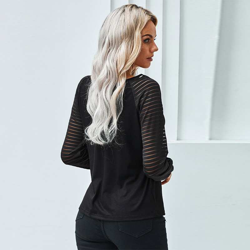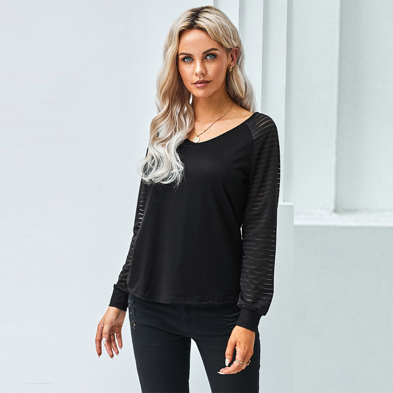 Ladies Slim White Black V-Neck Top Tulle Stripe Fall Pullover Free Mail Promotion