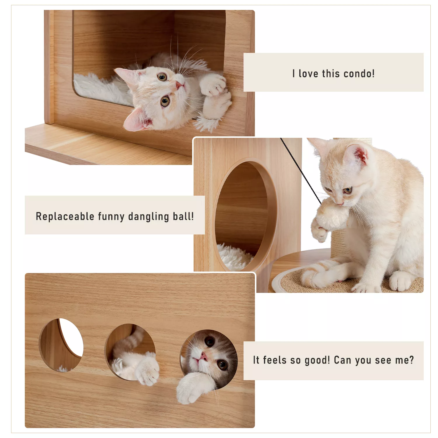 Modern Cat Tree Wooden Multi-Level Cat Tower Scratcher Luxury Nest Cat Climbing Frame Cozy Condos Deeper Version Dangling Balls