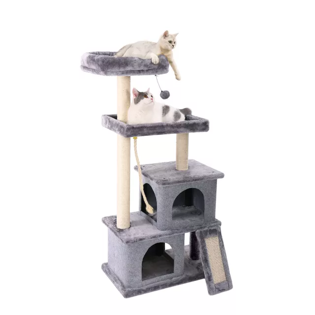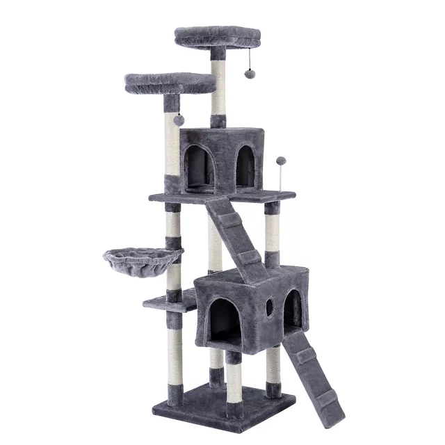 MULTILEVEL FUN: The 5 level platforms design provide different jumping heights for your cats to satisfy their daily exercise. Two roomy condos are super comfortable for your pet to roll, with lateral door and round holes are designed for cats to observe outdoor as well as allowing them to get in and out or jump to the top hammock. A cozy perch on the top not only allow your cat to have a nice rest, but also offer a best spot to enjoy sunshine and outside scenery.