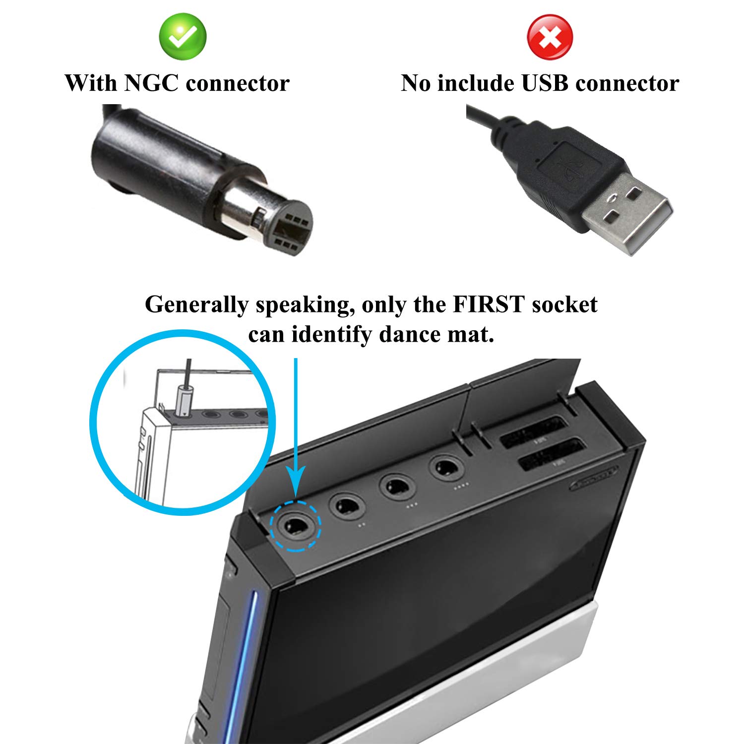 Note: This dance pad uses the NGC plug (not USB plug), please open the cover on the top of console to check if your Wii console has the NGC socket before you buy this dance pad. The following consoles do not have GameCube ports installed and therefore will not support the dance mat. These consoles are: Wii White (with Wii Sports and Wii Party), Wii Blue (with Mario and Sonic at the London 2012 Olympic Games), Wii Black (with Mario Kart and Wii wheel), Wii Black (with Wii Fit Plus and Balance Board), all Wii U models. If you want to use this dance pad on a console without GameCube ports, you will need a special NGC to USB adapter.