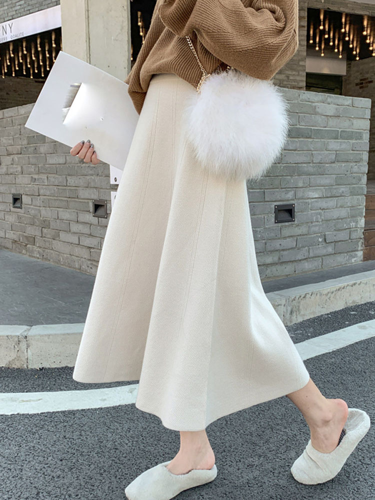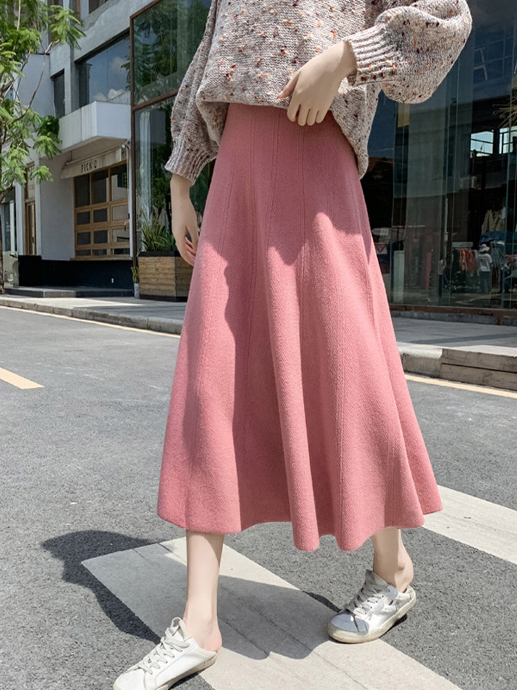 OHRYIYIE Women Thick Knit Skirt Autumn Winter Female High Waist Warm A-line Skirt Women Casual All-match Midi Long Skirt Lady