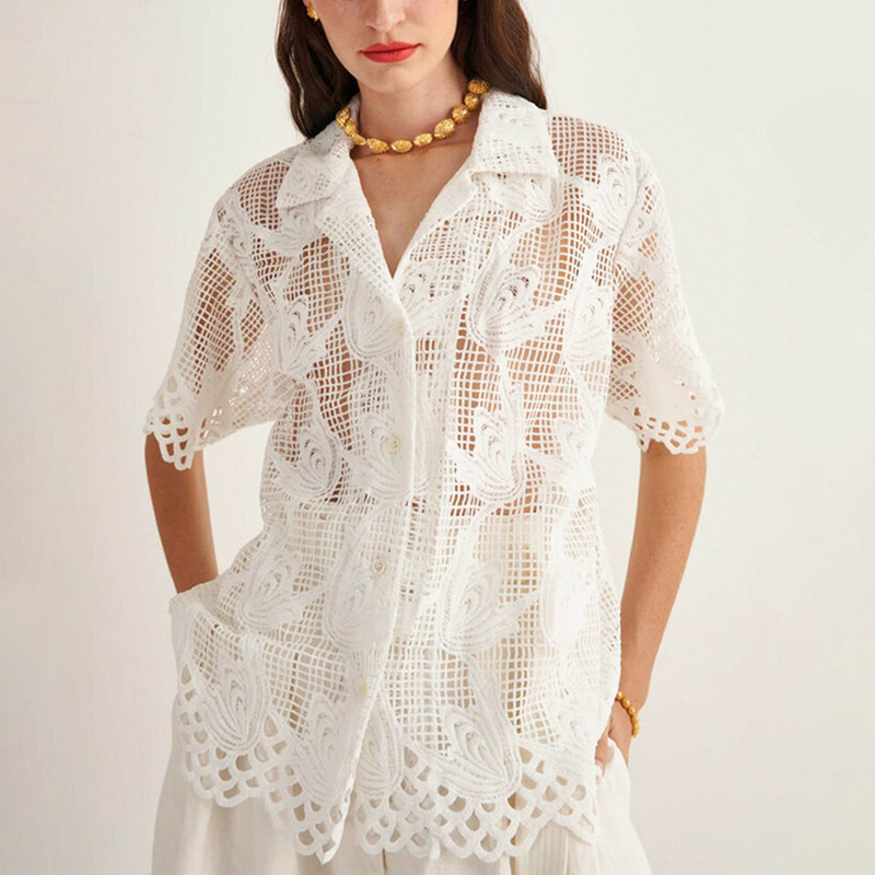 OROT@ Summer 2 Colors Polyester Hollow Lace Short Sleeve Lapel Daily Casual Cardigan Blouse