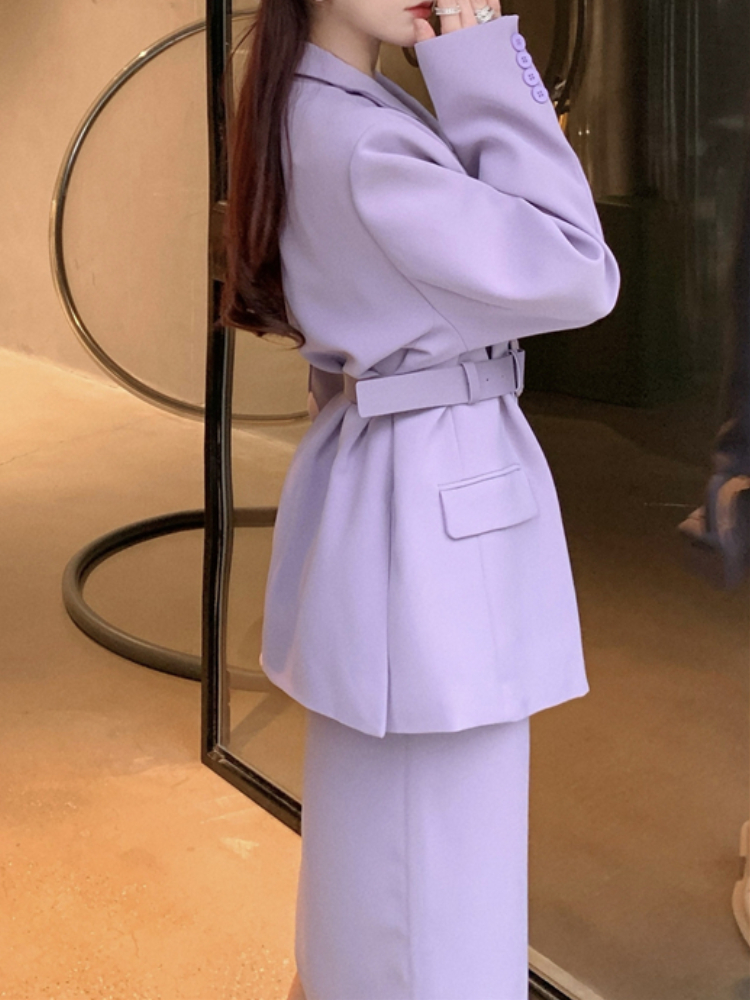Office Ladies' Suits With Skirt Two-Piece Setup Autumn Women Purple With Belt Blazer Chic High-Waist Split Skirt Outfit