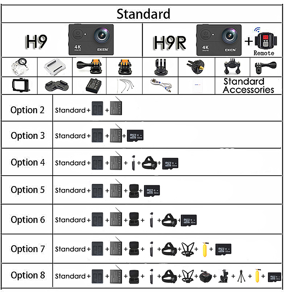 Option 8: Standard + charger + Battery +Collection bag +Head strap +Chest Strap + Car Sucker Holder +Wrist strap +Monopod +Tirpod +Floating stick + 32GB TF Card
