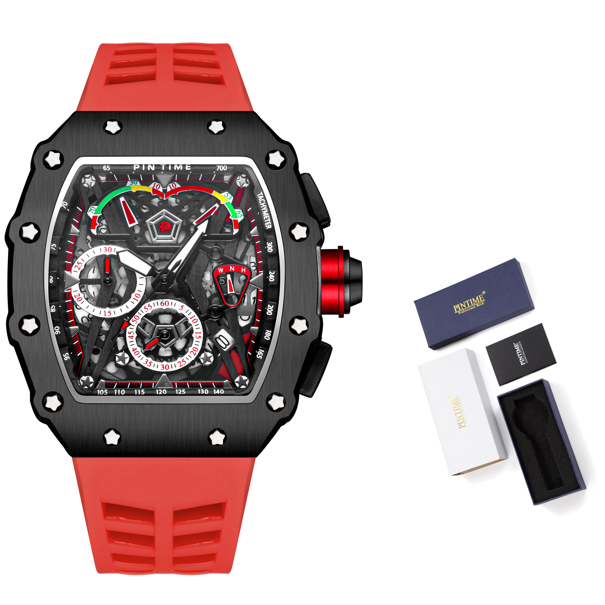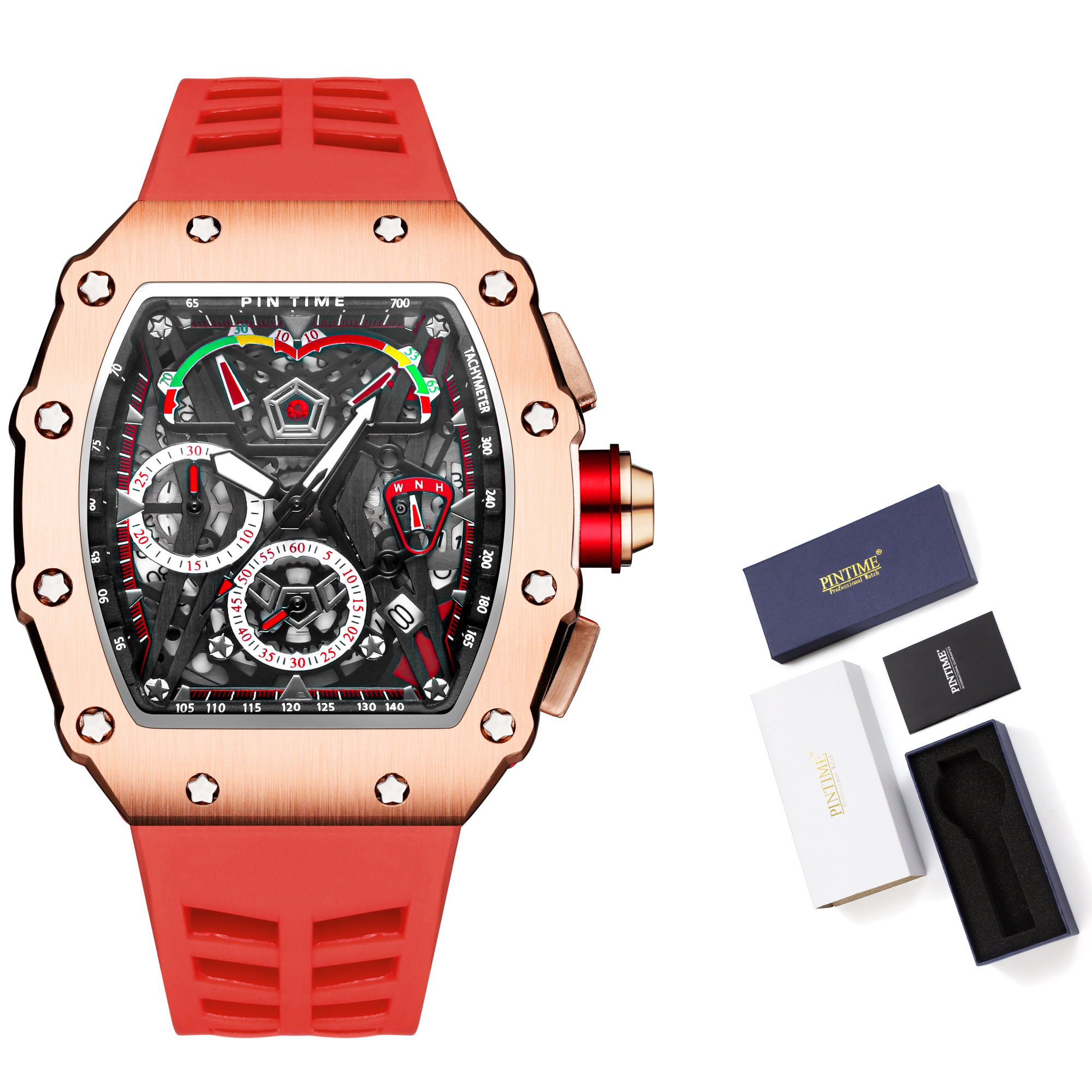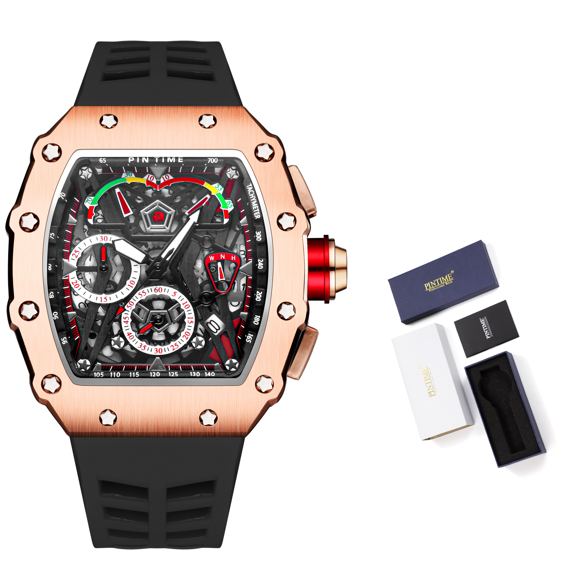 PINTIME Casual Men Sport Rose Gold Watch Chronograph Function Stopwatch Rubber Strap Auto Date Male Wristwatch